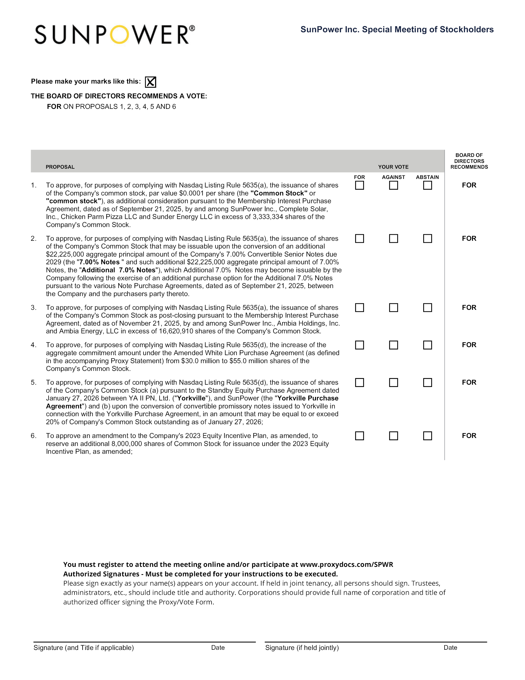 SunPower Inc. Special Meeting of Stockholders Please make your marks like this: THE BOARD OF DIRECTORS RECOMMENDS A VOTE: FOR ON PROPOSALS 1, 2, 3, 4, 5 AND 6 PROPOSAL YOUR VOTE 1. To approve, for purposes of complying with Nasdaq Listing Rule 5635(a), the issuance of shares of the Company’s common stock, par value $0.0001 per share (the “Common Stock” or “common stock”), as additional consideration pursuant to the Membership Interest Purchase Agreement, dated as of September 21, 2025, by and among SunPower Inc., Complete Solar, Inc., Chicken Parm Pizza LLC and Sunder Energy LLC in excess of 3,333,334 shares of the Company’s Common Stock 2. To approve, for purposes of complying with Nasdaq Listing Rule 5635(a), the issuance of shares of the Company’s Common Stock that may be issuable upon the conversion of an additional $22,225,000 aggregate principal amount of the Company’s 7.00% Convertible Senior Notes due 2029 (the “7.00% Notes “ and such additional $22,225,000 aggregate principal amount of 7.00% Notes, the “Additional 7.0% Notes”), which Additional 7.0% Notes may become issuable by the Company following the exercise of an additional purchase option for the Additional 7.0% Notes pursuant to the various Note Purchase Agreements, dated as of September 21, 2025, between the Company and the purchasers party thereto. 3. To approve, for purposes of complying with Nasdaq Listing Rule 5635(a), the issuance of shares of the Company’s Common Stock as post-closing pursuant to the Membership Interest Purchase Agreement, dated as of November 21, 2025, by and among SunPower Inc., Ambia Holdings, Inc. and Ambia Energy, LLC in excess of 16,620,910 shares of the Company’s Common Stock. 4. To approve, for purposes of complying with Nasdaq Listing Rule 5635(d), the increase of the aggregate commitment amount under the Amended White Lion Purchase Agreement (as defined in the accompanying Proxy Statement) from $30.0 million to $55.0 million shares of the Company’s Common Stock. 5. To approve, for purposes of complying with Nasdaq Listing Rule 5635(d), the issuance of shares of the Company’s Common Stock (a) pursuant to the Standby Equity Purchase Agreement dated January 27, 2026 between YA II PN, Ltd. (“Yorkville”), and SunPower (the “Yorkville Purchase Agreement”) and (b) upon the conversion of convertible promissory notes issued to Yorkville in connection with the Yorkville Purchase Agreement, in an amount that may be equal to or exceed 20% of Company’s Common Stock outstanding as of January 27, 2026; 6. To approve an amendment to the Company’s 2023 Equity Incentive Plan, as amended, to reserve an additional 8,000,000 shares of Common Stock for issuance under the 2023 Equity Incentive Plan, as amended FOR AGAINST ABSTAIN BOARD OF DIRECTORS RECOMMENDS FOR You must register to attend the meeting online and/or participate at www.proxydocs.com/SPWR Authorized Signatures - Must be completed for your instructions to be executed. Please sign exactly as your name(s) appears on your account. If held in joint tenancy, all persons should sign. Trustees, administrators, etc., should include title and authority. Corporations should provide full name of corporation and title of authorized officer signing the Proxy/Vote Form. Signature (and Title if applicable) Date Signature (if held jointly) Date