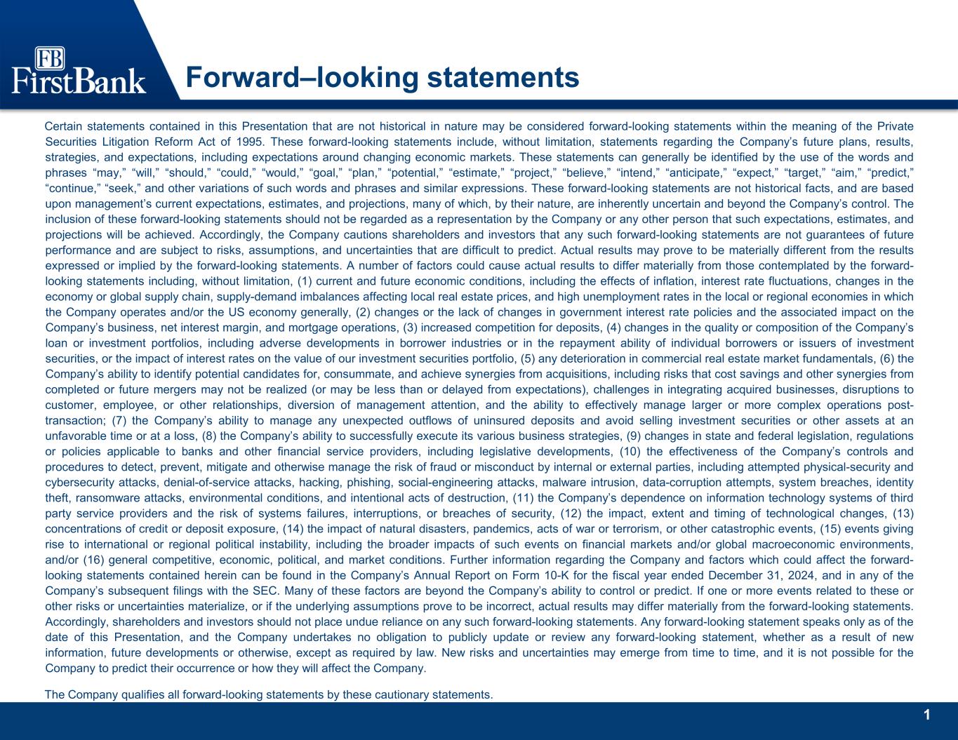 1 Forward–looking statements Certain statements contained in this Presentation that are not historical in nature may be considered forward-looking statements within the meaning of the Private Securities Litigation Reform Act of 1995. These forward-looking statements include, without limitation, statements regarding the Company’s future plans, results, strategies, and expectations, including expectations around changing economic markets. These statements can generally be identified by the use of the words and phrases “may,” “will,” “should,” “could,” “would,” “goal,” “plan,” “potential,” “estimate,” “project,” “believe,” “intend,” “anticipate,” “expect,” “target,” “aim,” “predict,” “continue,” “seek,” and other variations of such words and phrases and similar expressions. These forward-looking statements are not historical facts, and are based upon management’s current expectations, estimates, and projections, many of which, by their nature, are inherently uncertain and beyond the Company’s control. The inclusion of these forward-looking statements should not be regarded as a representation by the Company or any other person that such expectations, estimates, and projections will be achieved. Accordingly, the Company cautions shareholders and investors that any such forward-looking statements are not guarantees of future performance and are subject to risks, assumptions, and uncertainties that are difficult to predict. Actual results may prove to be materially different from the results expressed or implied by the forward-looking statements. A number of factors could cause actual results to differ materially from those contemplated by the forward- looking statements including, without limitation, (1) current and future economic conditions, including the effects of inflation, interest rate fluctuations, changes in the economy or global supply chain, supply-demand imbalances affecting local real estate prices, and high unemployment rates in the local or regional economies in which the Company operates and/or the US economy generally, (2) changes or the lack of changes in government interest rate policies and the associated impact on the Company’s business, net interest margin, and mortgage operations, (3) increased competition for deposits, (4) changes in the quality or composition of the Company’s loan or investment portfolios, including adverse developments in borrower industries or in the repayment ability of individual borrowers or issuers of investment securities, or the impact of interest rates on the value of our investment securities portfolio, (5) any deterioration in commercial real estate market fundamentals, (6) the Company’s ability to identify potential candidates for, consummate, and achieve synergies from acquisitions, including risks that cost savings and other synergies from completed or future mergers may not be realized (or may be less than or delayed from expectations), challenges in integrating acquired businesses, disruptions to customer, employee, or other relationships, diversion of management attention, and the ability to effectively manage larger or more complex operations post- transaction; (7) the Company’s ability to manage any unexpected outflows of uninsured deposits and avoid selling investment securities or other assets at an unfavorable time or at a loss, (8) the Company’s ability to successfully execute its various business strategies, (9) changes in state and federal legislation, regulations or policies applicable to banks and other financial service providers, including legislative developments, (10) the effectiveness of the Company’s controls and procedures to detect, prevent, mitigate and otherwise manage the risk of fraud or misconduct by internal or external parties, including attempted physical-security and cybersecurity attacks, denial-of-service attacks, hacking, phishing, social-engineering attacks, malware intrusion, data-corruption attempts, system breaches, identity theft, ransomware attacks, environmental conditions, and intentional acts of destruction, (11) the Company’s dependence on information technology systems of third party service providers and the risk of systems failures, interruptions, or breaches of security, (12) the impact, extent and timing of technological changes, (13) concentrations of credit or deposit exposure, (14) the impact of natural disasters, pandemics, acts of war or terrorism, or other catastrophic events, (15) events giving rise to international or regional political instability, including the broader impacts of such events on financial markets and/or global macroeconomic environments, and/or (16) general competitive, economic, political, and market conditions. Further information regarding the Company and factors which could affect the forward- looking statements contained herein can be found in the Company’s Annual Report on Form 10-K for the fiscal year ended December 31, 2024, and in any of the Company’s subsequent filings with the SEC. Many of these factors are beyond the Company’s ability to control or predict. If one or more events related to these or other risks or uncertainties materialize, or if the underlying assumptions prove to be incorrect, actual results may differ materially from the forward-looking statements. Accordingly, shareholders and investors should not place undue reliance on any such forward-looking statements. Any forward-looking statement speaks only as of the date of this Presentation, and the Company undertakes no obligation to publicly update or review any forward-looking statement, whether as a result of new information, future developments or otherwise, except as required by law. New risks and uncertainties may emerge from time to time, and it is not possible for the Company to predict their occurrence or how they will affect the Company. The Company qualifies all forward-lookin