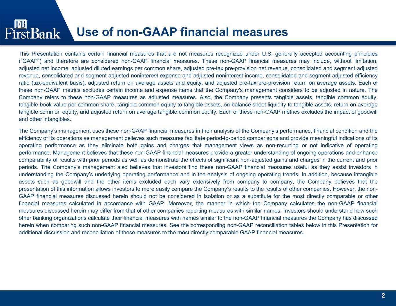 2 Use of non-GAAP financial measures This Presentation contains certain financial measures that are not measures recognized under U.S. generally accepted accounting principles (“GAAP”) and therefore are considered non-GAAP financial measures. These non-GAAP financial measures may include, without limitation, adjusted net income, adjusted diluted earnings per common share, adjusted pre-tax pre-provision net revenue, consolidated and segment adjusted revenue, consolidated and segment adjusted noninterest expense and adjusted noninterest income, consolidated and segment adjusted efficiency ratio (tax-equivalent basis), adjusted return on average assets and equity, and adjusted pre-tax pre-provision return on average assets. Each of these non-GAAP metrics excludes certain income and expense items that the Company’s management considers to be adjusted in nature. The Company refers to these non-GAAP measures as adjusted measures. Also, the Company presents tangible assets, tangible common equity, tangible book value per common share, tangible common equity to tangible assets, on-balance sheet liquidity to tangible assets, return on average tangible common equity, and adjusted return on average tangible common equity. Each of these non-GAAP metrics excludes the impact of goodwill and other intangibles. The Company’s management uses these non-GAAP financial measures in their analysis of the Company’s performance, financial condition and the efficiency of its operations as management believes such measures facilitate period-to-period comparisons and provide meaningful indications of its operating performance as they eliminate both gains and charges that management views as non-recurring or not indicative of operating performance. Management believes that these non-GAAP financial measures provide a greater understanding of ongoing operations and enhance comparability of results with prior periods as well as demonstrate the effects of significant non-adjusted gains and charges in the current and prior periods. The Company’s management also believes that investors find these non-GAAP financial measures useful as they assist investors in understanding the Company’s underlying operating performance and in the analysis of ongoing operating trends. In addition, because intangible assets such as goodwill and the other items excluded each vary extensively from company to company, the Company believes that the presentation of this information allows investors to more easily compare the Company’s results to the results of other companies. However, the non- GAAP financial measures discussed herein should not be considered in isolation or as a substitute for the most directly comparable or other financial measures calculated in accordance with GAAP. Moreover, the manner in which the Company calculates the non-GAAP financial measures discussed herein may differ from that of other companies reporting measures with similar names. Investors should understand how such other banking organizations calculate their financial measures with names similar to the non-GAAP financial measures the Company has discussed herein when comparing such non-GAAP financial measures. See the corresponding non-GAAP reconciliation tables below in this Presentation for additional discussion and reconciliation of these measures to the most directly comparable GAAP financial measures.