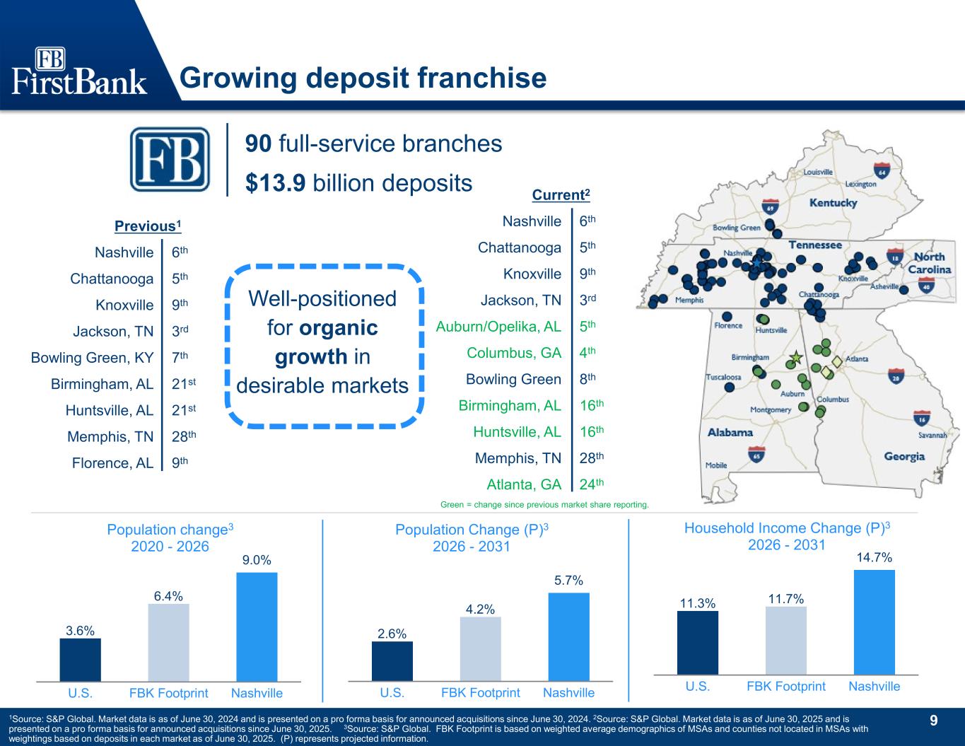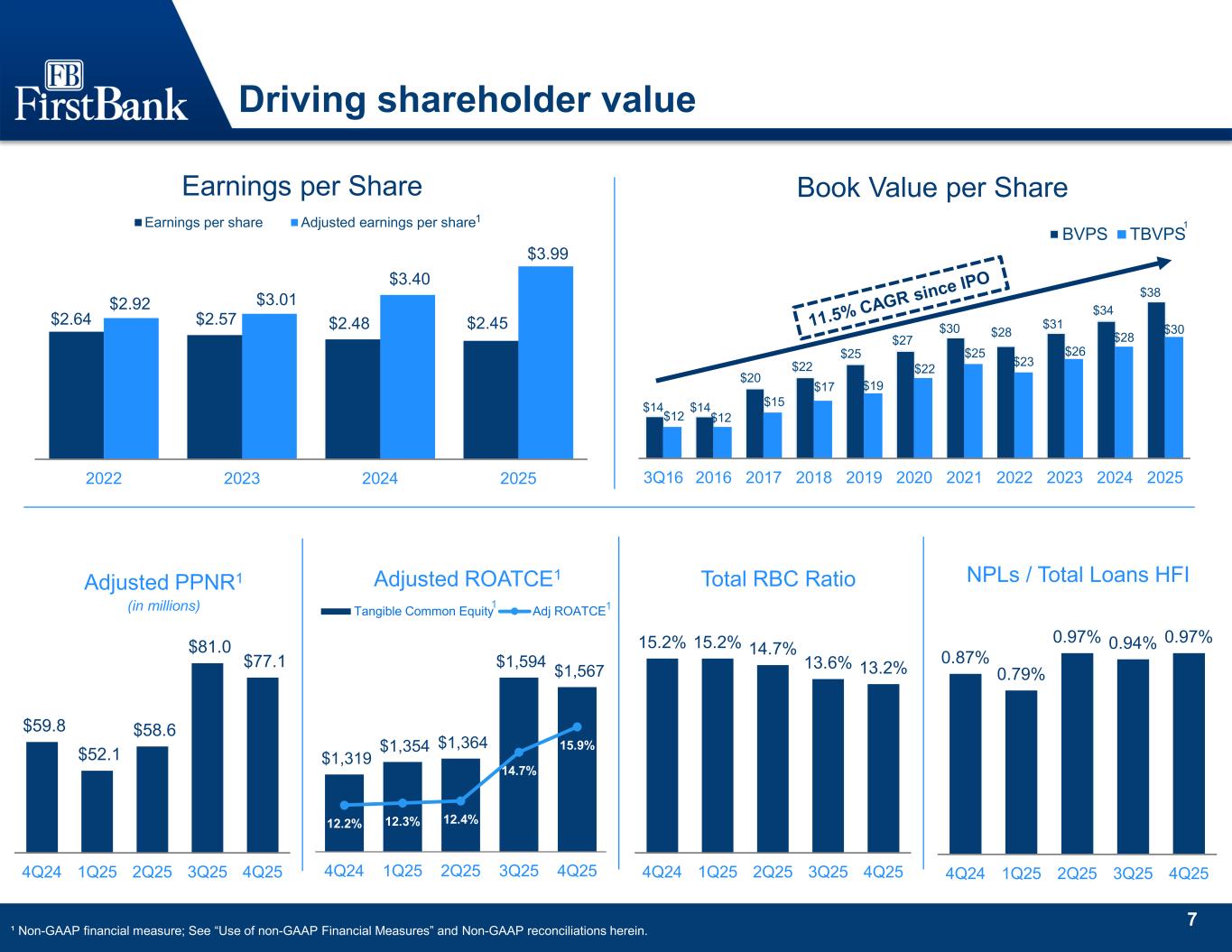 6 Recent corporate history 2021 Awarded “Top Workplaces” by the Tennessean; Named one of American Banker’s “Best Places to Work” 2020 • Completed acquisition of FNB Financial Corporation; enter Bowling Green MSA ranked 7th in deposit market share • Converted online and mobile consumer banking platforms • Lift out of commercial team in Memphis • Completed acquisition of Franklin Financial Network; moved from 12th to 6th in the Nashville MSA in deposit market share • Raised $100 million of 4.50% subordinated debt 2022 • Authorized $100 million share repurchase plan in February 2021 • Expanded banking division into Central Alabama in March 2021 with hiring of two experienced senior bankers in Birmingham 2023 • Authorized $100 million share repurchase plan in March 2022 • Completed restructuring of Mortgage segment and closure of direct-to- consumer delivery channel • Acquired naming rights for Vanderbilt University football stadium 2024 • Began implementation of the FirstBank Way as the foundation to position FirstBank as a premier banking franchise with elite financial performance now and in the future by standardizing sales and services under one operating model • Reduced core operating expense projections in FY 2023 by $20 million annualized • Sold $101 million of AFS debt securities and captured 4.27% yield improvement in FY 2023 • Reduced construction loans to bank Tier 1 capital plus ACL2 from 119% at 4Q22 to 93% as of 4Q23; increased Total RBC ratio from 13.1% at 4Q22 to 14.5% as of 4Q23 • Market expansion into Asheville, NC and Tuscaloosa, AL • Completed 2 securities portfolio restructure transactions totaling $526M sold and reinvested at a weighted average yield improvement of ~3.3% • Continued focus on operating efficiency measures resulting in a core efficiency ratio* of 54.6% in 4Q24, down from 61.7% in 4Q23 • Well positioned with a strong balance sheet, evidenced by strong capital ratios – • 12.8% CET1 • 15.2% RBC Awarded “Top Workplaces” by the Tennessean 2025 • Closed merger with Southern States Bancorp Inc. (“SSBK”) • About SSBK: • Headquarters: Anniston, AL • Previously publicly traded as SSBK on the NASDAQ • Geography: East Alabama & West Georgia • 15 branches & 2 LPOs • $2.9 billion in Total Assets • Deal closed & systems converted in 3Q25 1Non-GAAP financial measure; See “Use of non-GAAP Financial Measures” and Non-GAAP reconciliations herein. 2Concentration ratio for FirstBank. Note: Financial data presented on a consolidated basis. Adj ROAA1 Adj ROATCE1 Total Assets 1.67% 19.4% $11.2 bn Adj ROAA1 Adj ROATCE1 Total Assets 1.11% 12.8% $12.6 bn Adj ROAA1 Adj ROATCE1 Total Assets 1.12% 12.9% $12.8 bn Adj ROAA1 Adj ROATCE1 Total Assets 1.52% 16.9% $12.6 bn Adj ROAA1 Adj ROATCE1 Total Assets 1.25% 12.9% $13.2 bn Adj ROAA1 Adj ROATCE1 Total Assets 1.37% 14.0% $16.3 bn