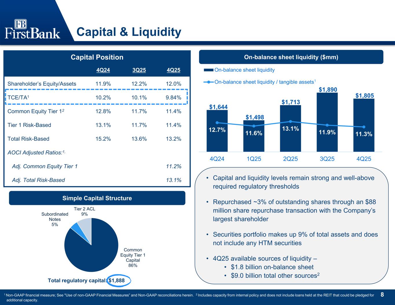 7 Driving shareholder value ¹ Non-GAAP financial measure; See “Use of non-GAAP Financial Measures” and Non-GAAP reconciliations herein. $2.64 $2.57 $2.48 $2.45 $2.92 $3.01 $3.40 $3.99 2022 2023 2024 2025 Earnings per share Adjusted earnings per share Earnings per Share $14 $14 $20 $22 $25 $27 $30 $28 $31 $34 $38 $12 $12 $15 $17 $19 $22 $25 $23 $26 $28 $30 3Q16 2016 2017 2018 2019 2020 2021 2022 2023 2024 2025 BVPS TBVPS 15.2% 15.2% 14.7% 13.6% 13.2% 4Q24 1Q25 2Q25 3Q25 4Q25 0.87% 0.79% 0.97% 0.94% 0.97% 4Q24 1Q25 2Q25 3Q25 4Q25 $59.8 $52.1 $58.6 $81.0 $77.1 4Q24 1Q25 2Q25 3Q25 4Q25 Book Value per Share Total RBC Ratio NPLs / Total Loans HFIAdjusted ROATCE1Adjusted PPNR1 (in millions) 1 1 $1,319 $1,354 $1,364 $1,594 $1,567 12.2% 12.3% 12.4% 14.7% 15.9% 4Q24 1Q25 2Q25 3Q25 4Q25 Tangible Common Equity Adj ROATCE11