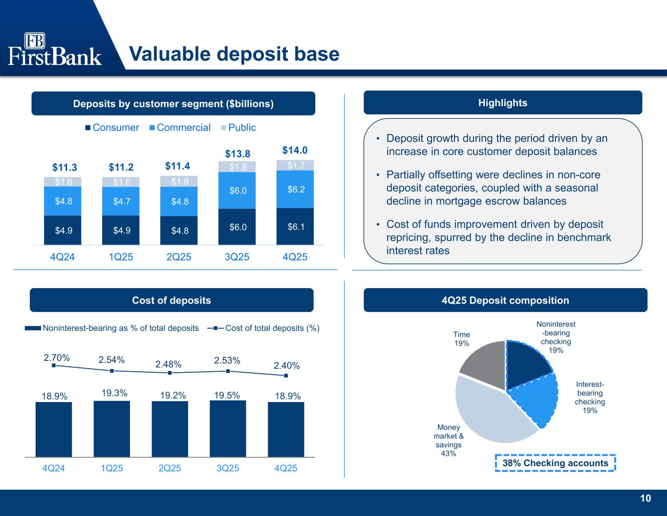 9 Well-positioned for organic growth in desirable markets Growing deposit franchise 1Source: S&P Global. Market data is as of June 30, 2024 and is presented on a pro forma basis for announced acquisitions since June 30, 2024. 2Source: S&P Global. Market data is as of June 30, 2025 and is presented on a pro forma basis for announced acquisitions since June 30, 2025. 3Source: S&P Global. FBK Footprint is based on weighted average demographics of MSAs and counties not located in MSAs with weightings based on deposits in each market as of June 30, 2025. (P) represents projected information. 3.6% 6.4% 9.0% U.S. FBK Footprint Nashville Population change3 2020 - 2026 2.6% 4.2% 5.7% U.S. FBK Footprint Nashville Population Change (P)3 2026 - 2031 11.3% 11.7% 14.7% U.S. FBK Footprint Nashville Household Income Change (P)3 2026 - 2031 90 full-service branches $13.9 billion deposits Previous1 Nashville 6th Chattanooga 5th Knoxville 9th Jackson, TN 3rd Bowling Green, KY 7th Birmingham, AL 21st Huntsville, AL 21st Memphis, TN 28th Florence, AL 9th Current2 Nashville 6th Chattanooga 5th Knoxville 9th Jackson, TN 3rd Auburn/Opelika, AL 5th Columbus, GA 4th Bowling Green 8th Birmingham, AL 16th Huntsville, AL 16th Memphis, TN 28th Atlanta, GA 24th Green = change since previous market share reporting.