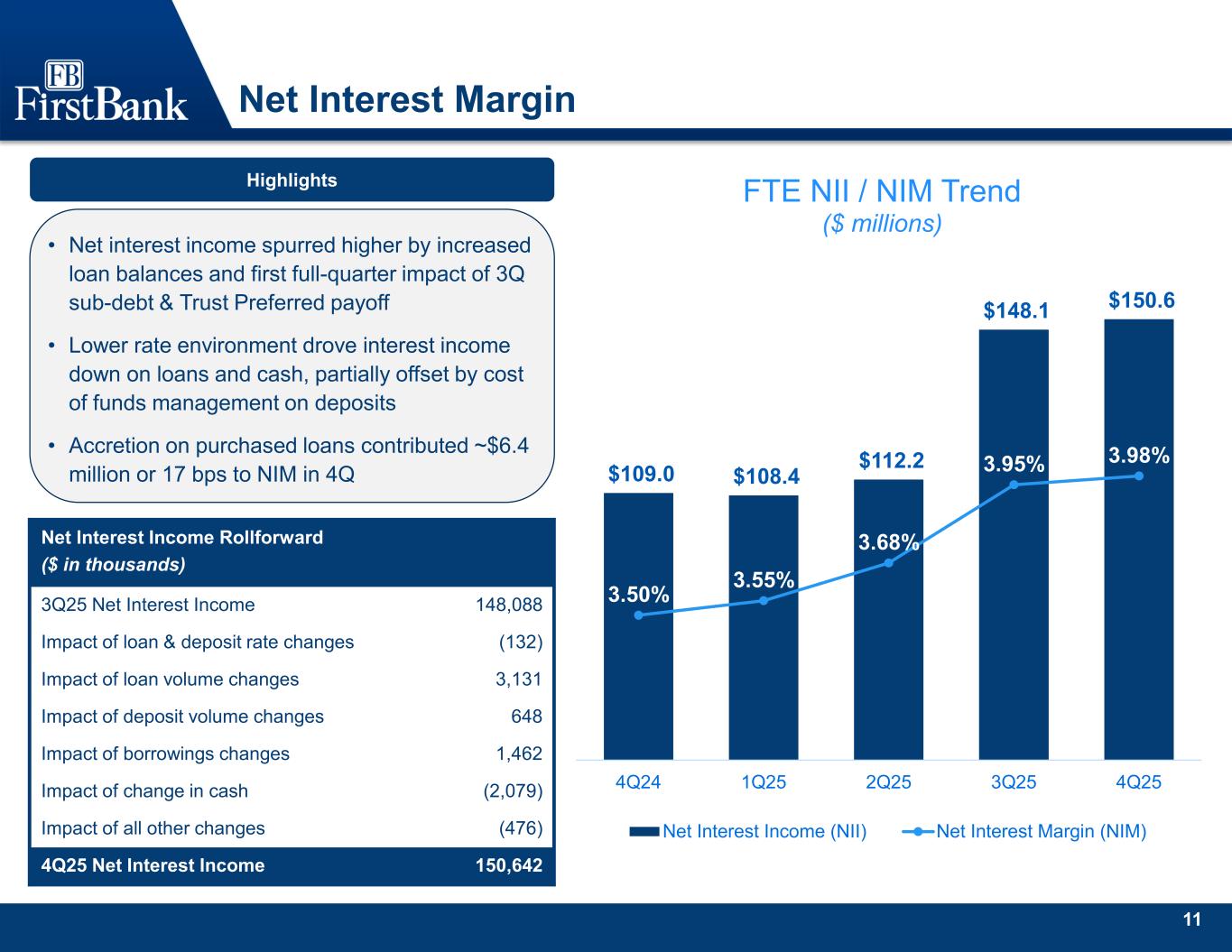 10 Valuable deposit base Cost of deposits 18.9% 19.3% 19.2% 19.5% 18.9% 2.70% 2.54% 2.48% 2.53% 2.40% 0.00% 0.50% 1.00% 1.50% 2.00% 2.50% 3.00% 0.0% 5.0% 10.0% 15.0% 20.0% 25.0% 30.0% 35.0% 4Q24 1Q25 2Q25 3Q25 4Q25 Noninterest-bearing as % of total deposits Cost of total deposits (%) Deposits by customer segment ($billions) • Deposit growth during the period driven by an increase in core customer deposit balances • Partially offsetting were declines in non-core deposit categories, coupled with a seasonal decline in mortgage escrow balances • Cost of funds improvement driven by deposit repricing, spurred by the decline in benchmark interest rates Highlights Noninterest -bearing checking 19% Interest- bearing checking 19% Money market & savings 43% Time 19% 38% Checking accounts 4Q25 Deposit composition $4.9 $4.9 $4.8 $6.0 $6.1 $4.8 $4.7 $4.8 $6.0 $6.2 $1.6 $1.6 $1.8 $1.8 $1.7 $11.3 $11.2 $11.4 $13.8 $14.0 4Q24 1Q25 2Q25 3Q25 4Q25 Consumer Commercial Public Total