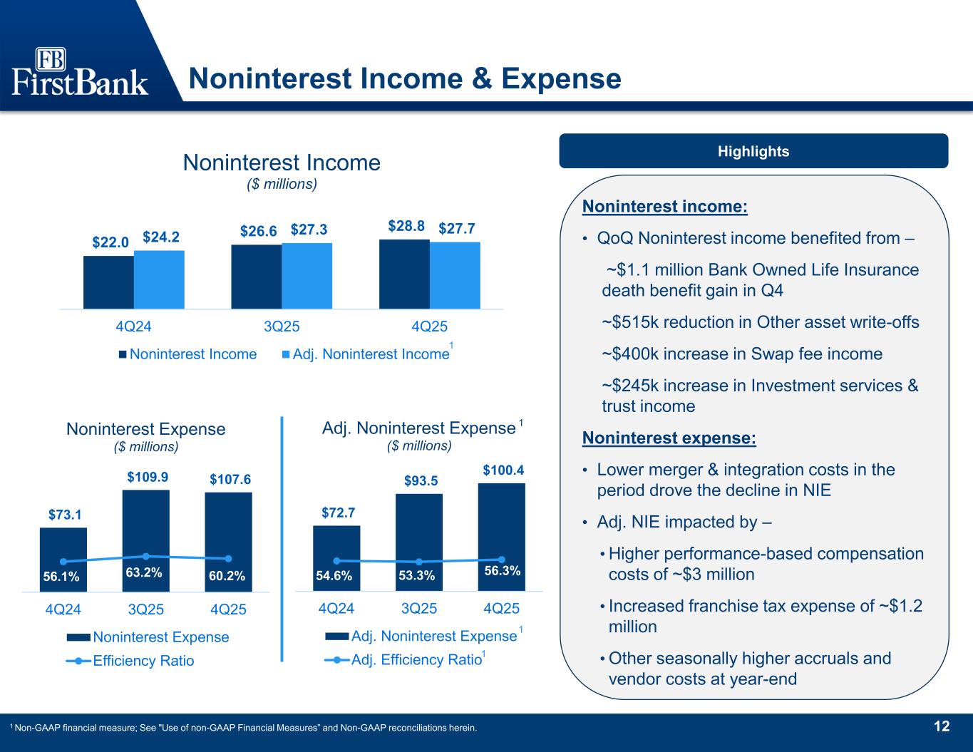 11 Net Interest Margin $109.0 $108.4 $112.2 $148.1 $150.6 3.50% 3.55% 3.68% 3.95% 3.98% 4Q24 1Q25 2Q25 3Q25 4Q25 FTE NII / NIM Trend ($ millions) Net Interest Income (NII) Net Interest Margin (NIM) Highlights Net Interest Income Rollforward ($ in thousands) 3Q25 Net Interest Income 148,088 Impact of loan & deposit rate changes (132) Impact of loan volume changes 3,131 Impact of deposit volume changes 648 Impact of borrowings changes 1,462 Impact of change in cash (2,079) Impact of all other changes (476) 4Q25 Net Interest Income 150,642 • Net interest income spurred higher by increased loan balances and first full-quarter impact of 3Q sub-debt & Trust Preferred payoff • Lower rate environment drove interest income down on loans and cash, partially offset by cost of funds management on deposits • Accretion on purchased loans contributed ~$6.4 million or 17 bps to NIM in 4Q