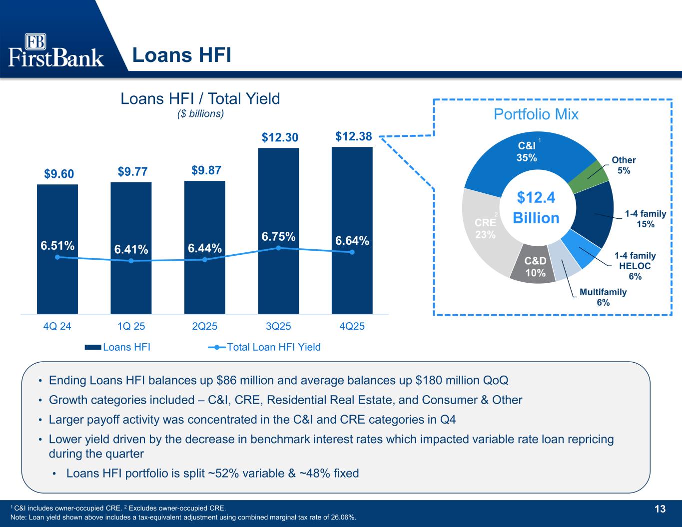 12 Noninterest Income & Expense $73.1 $109.9 $107.6 56.1% 63.2% 60.2% 4Q24 3Q25 4Q25 Noninterest Expense ($ millions) Noninterest Expense Efficiency Ratio $72.7 $93.5 $100.4 54.6% 53.3% 56.3% 4Q24 3Q25 4Q25 Adj. Noninterest Expense ($ millions) Adj. Noninterest Expense Adj. Efficiency Ratio $22.0 $26.6 $28.8 $24.2 $27.3 $27.7 4Q24 3Q25 4Q25 Noninterest Income ($ millions) Noninterest Income Adj. Noninterest Income Highlights 1 1 Non-GAAP financial measure; See "Use of non-GAAP Financial Measures” and Non-GAAP reconciliations herein. 1 1 1 Noninterest income: • QoQ Noninterest income benefited from – ~$1.1 million Bank Owned Life Insurance death benefit gain in Q4 ~$515k reduction in Other asset write-offs ~$400k increase in Swap fee income ~$245k increase in Investment services & trust income Noninterest expense: • Lower merger & integration costs in the period drove the decline in NIE • Adj. NIE impacted by – • Higher performance-based compensation costs of ~$3 million • Increased franchise tax expense of ~$1.2 million • Other seasonally higher accruals and vendor costs at year-end