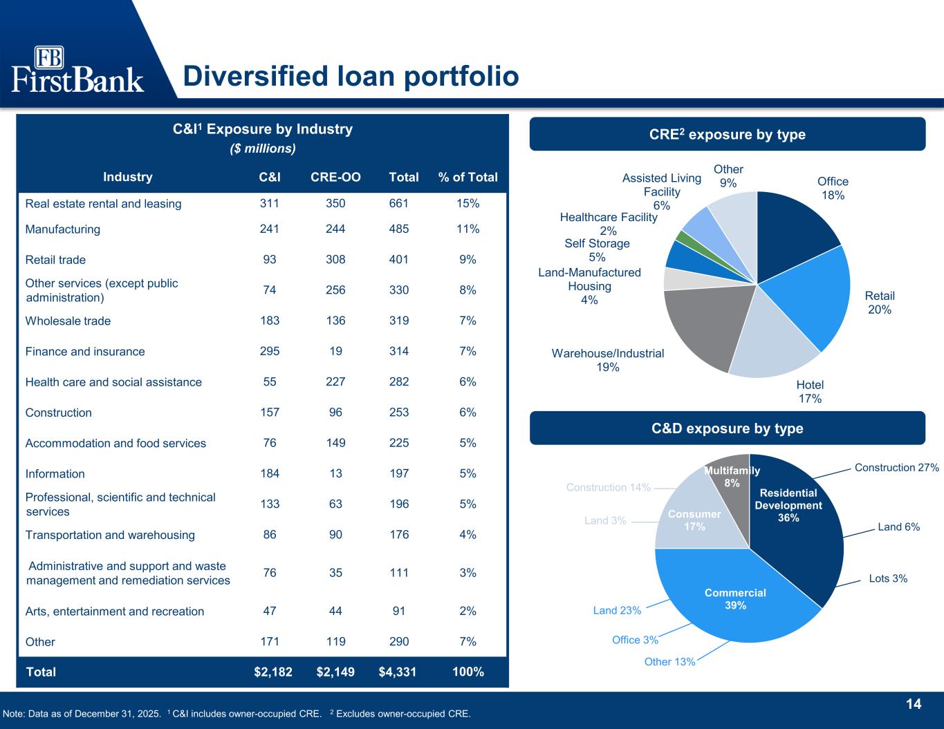 13 Loans HFI $9.60 $9.77 $9.87 $12.30 $12.38 6.51% 6.41% 6.44% 6.75% 6.64% 4Q 24 1Q 25 2Q25 3Q25 4Q25 Loans HFI / Total Yield ($ billions) Loans HFI Total Loan HFI Yield 1-4 family 15% 1-4 family HELOC 6% Multifamily 6% C&D 10% CRE 23% C&I 35% Other 5% Portfolio Mix $12.4 Billion 1 C&I includes owner-occupied CRE. 2 Excludes owner-occupied CRE. Note: Loan yield shown above includes a tax-equivalent adjustment using combined marginal tax rate of 26.06%. 1 2 • Ending Loans HFI balances up $86 million and average balances up $180 million QoQ • Growth categories included – C&I, CRE, Residential Real Estate, and Consumer & Other • Larger payoff activity was concentrated in the C&I and CRE categories in Q4 • Lower yield driven by the decrease in benchmark interest rates which impacted variable rate loan repricing during the quarter • Loans HFI portfolio is split ~52% variable & ~48% fixed
