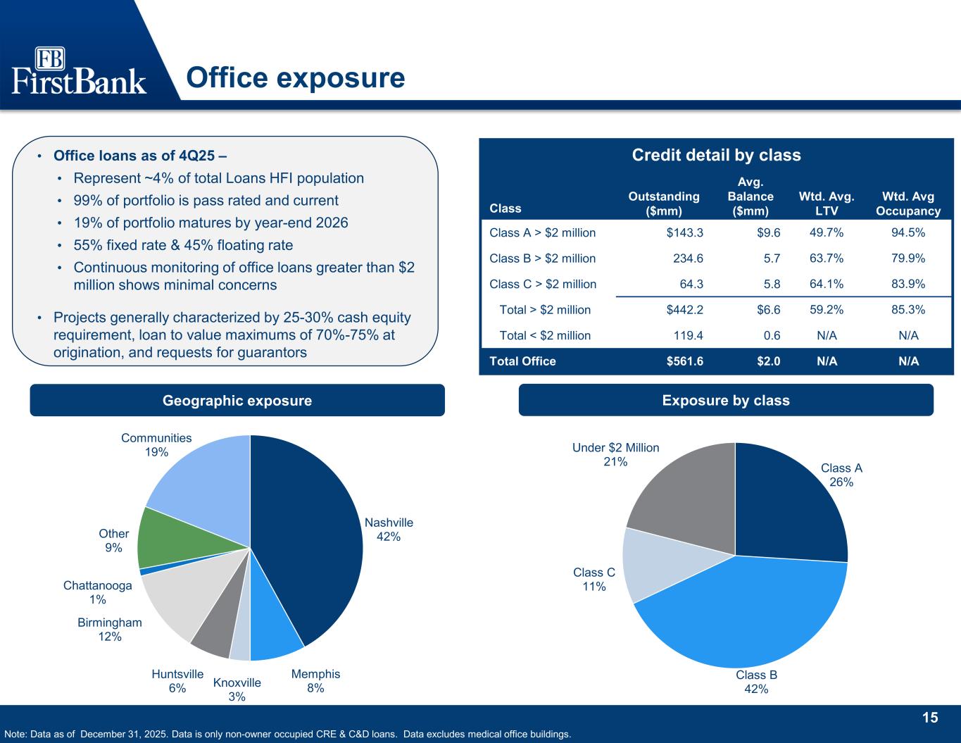 14 Office 18% Retail 20% Hotel 17% Warehouse/Industrial 19% Land-Manufactured Housing 4% Self Storage 5% Healthcare Facility 2% Assisted Living Facility 6% Other 9% Residential Development 36% Commercial 39% Consumer 17% Multifamily 8% Construction 27% Land 6% Lots 3% Diversified loan portfolio CRE2 exposure by type Note: Data as of December 31, 2025. 1 C&I includes owner-occupied CRE. 2 Excludes owner-occupied CRE. C&D exposure by type C&I1 Exposure by Industry ($ millions) Industry C&I CRE-OO Total % of Total Real estate rental and leasing 311 350 661 15% Manufacturing 241 244 485 11% Retail trade 93 308 401 9% Other services (except public administration) 74 256 330 8% Wholesale trade 183 136 319 7% Finance and insurance 295 19 314 7% Health care and social assistance 55 227 282 6% Construction 157 96 253 6% Accommodation and food services 76 149 225 5% Information 184 13 197 5% Professional, scientific and technical services 133 63 196 5% Transportation and warehousing 86 90 176 4% Administrative and support and waste management and remediation services 76 35 111 3% Arts, entertainment and recreation 47 44 91 2% Other 171 119 290 7% Total $2,182 $2,149 $4,331 100% Land 23% Office 3% Other 13% Construction 14% Land 3%