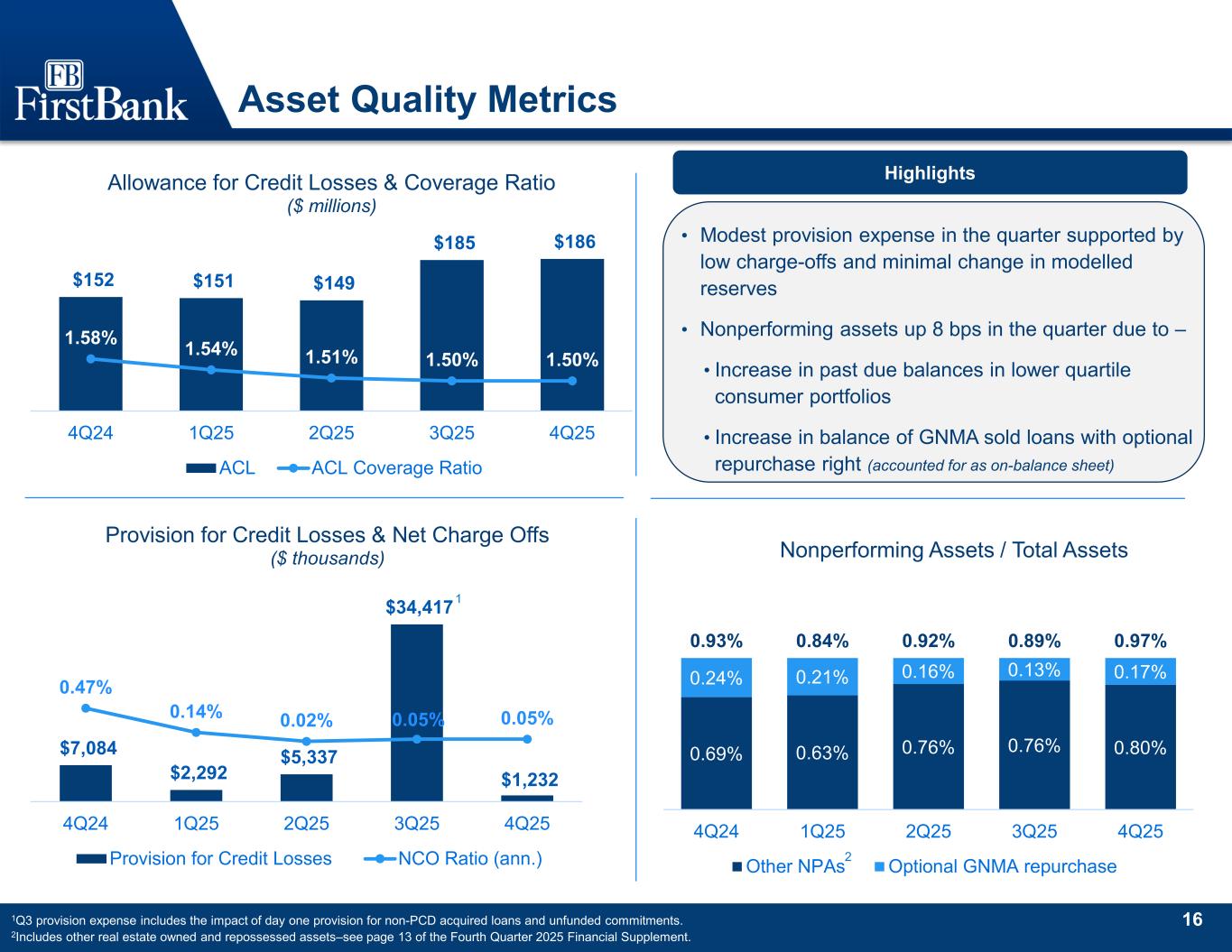 15 Nashville 42% Memphis 8%Knoxville 3% Huntsville 6% Birmingham 12% Chattanooga 1% Other 9% Communities 19% Class A 26% Class B 42% Class C 11% Under $2 Million 21% Office exposure • Office loans as of 4Q25 – • Represent ~4% of total Loans HFI population • 99% of portfolio is pass rated and current • 19% of portfolio matures by year-end 2026 • 55% fixed rate & 45% floating rate • Continuous monitoring of office loans greater than $2 million shows minimal concerns • Projects generally characterized by 25-30% cash equity requirement, loan to value maximums of 70%-75% at origination, and requests for guarantors Geographic exposure Note: Data as of December 31, 2025. Data is only non-owner occupied CRE & C&D loans. Data excludes medical office buildings. Credit detail by class Class Outstanding ($mm) Avg. Balance ($mm) Wtd. Avg. LTV Wtd. Avg Occupancy Class A > $2 million $143.3 $9.6 49.7% 94.5% Class B > $2 million 234.6 5.7 63.7% 79.9% Class C > $2 million 64.3 5.8 64.1% 83.9% Total > $2 million $442.2 $6.6 59.2% 85.3% Total < $2 million 119.4 0.6 N/A N/A Total Office $561.6 $2.0 N/A N/A Exposure by class