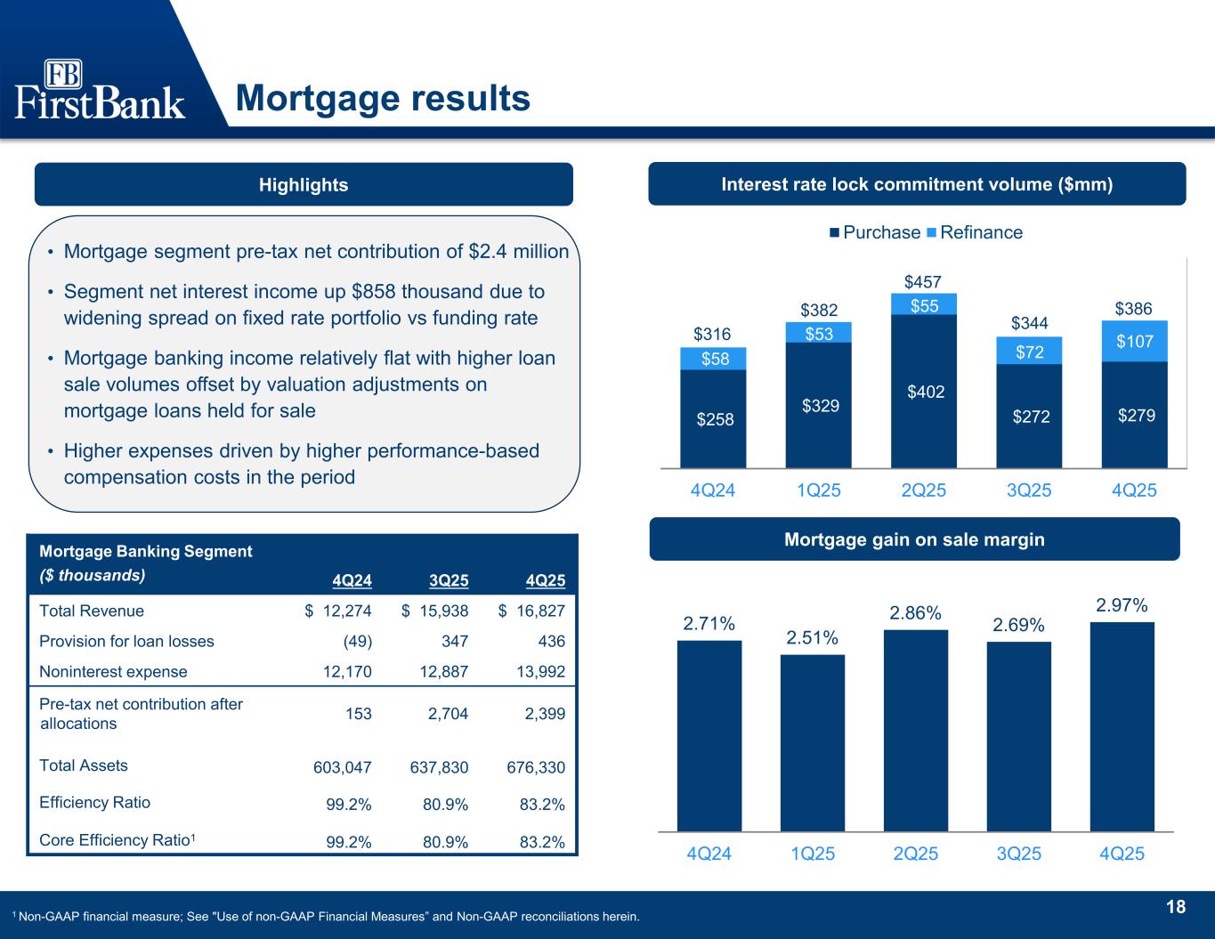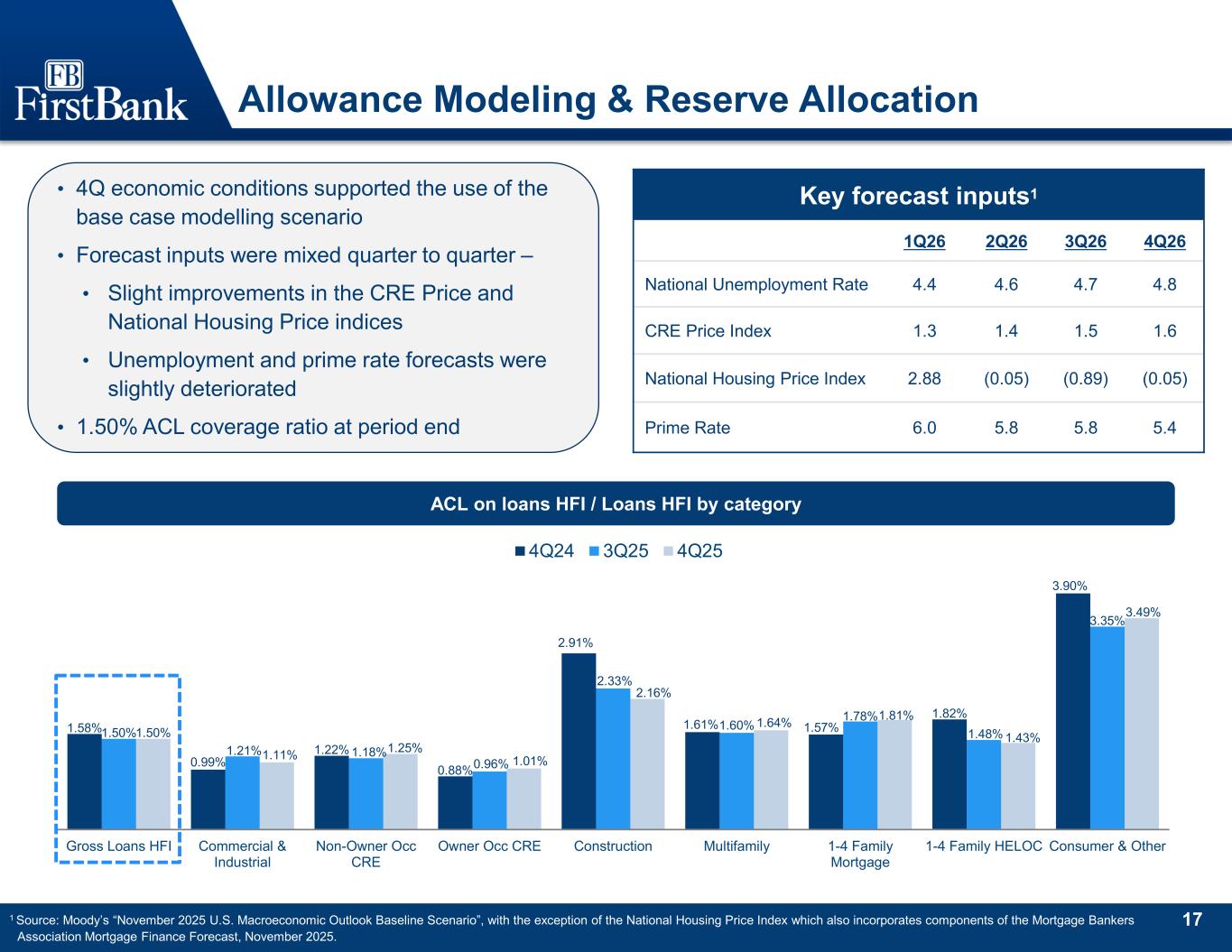 17 1.58% 0.99% 1.22% 0.88% 2.91% 1.61% 1.57% 1.82% 3.90% 1.50% 1.21% 1.18% 0.96% 2.33% 1.60% 1.78% 1.48% 3.35% 1.50% 1.11% 1.25% 1.01% 2.16% 1.64% 1.81% 1.43% 3.49% Gross Loans HFI Commercial & Industrial Non-Owner Occ CRE Owner Occ CRE Construction Multifamily 1-4 Family Mortgage 1-4 Family HELOC Consumer & Other 4Q24 3Q25 4Q25 Allowance Modeling & Reserve Allocation ACL on loans HFI / Loans HFI by category • 4Q economic conditions supported the use of the base case modelling scenario • Forecast inputs were mixed quarter to quarter – • Slight improvements in the CRE Price and National Housing Price indices • Unemployment and prime rate forecasts were slightly deteriorated • 1.50% ACL coverage ratio at period end Key forecast inputs1 1Q26 2Q26 3Q26 4Q26 National Unemployment Rate 4.4 4.6 4.7 4.8 CRE Price Index 1.3 1.4 1.5 1.6 National Housing Price Index 2.88 (0.05) (0.89) (0.05) Prime Rate 6.0 5.8 5.8 5.4 1 Source: Moody’s “November 2025 U.S. Macroeconomic Outlook Baseline Scenario”, with the exception of the National Housing Price Index which also incorporates components of the Mortgage Bankers Association Mortgage Finance Forecast, November 2025.