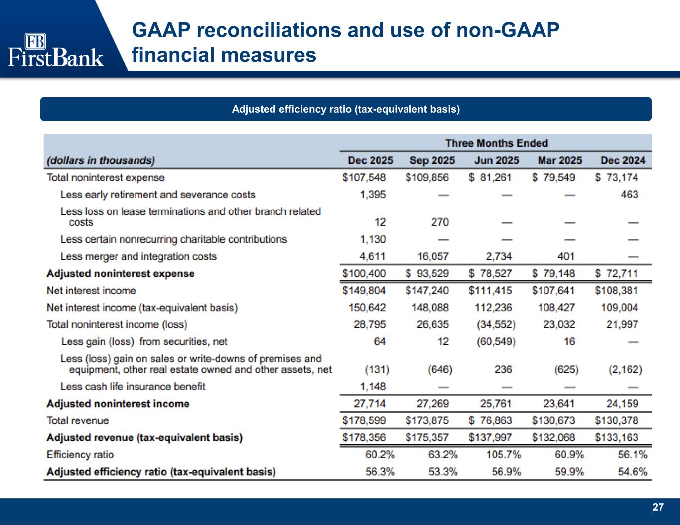 27 GAAP reconciliations and use of non-GAAP financial measures Adjusted efficiency ratio (tax-equivalent basis)
