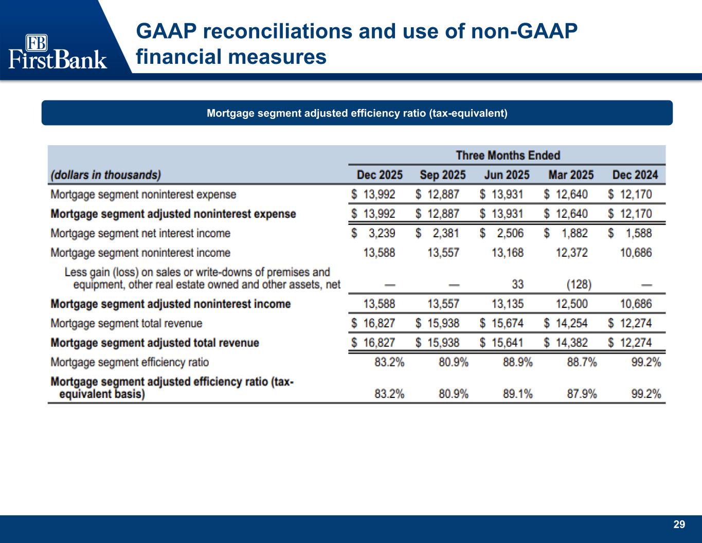 29 GAAP reconciliations and use of non-GAAP financial measures Mortgage segment adjusted efficiency ratio (tax-equivalent)