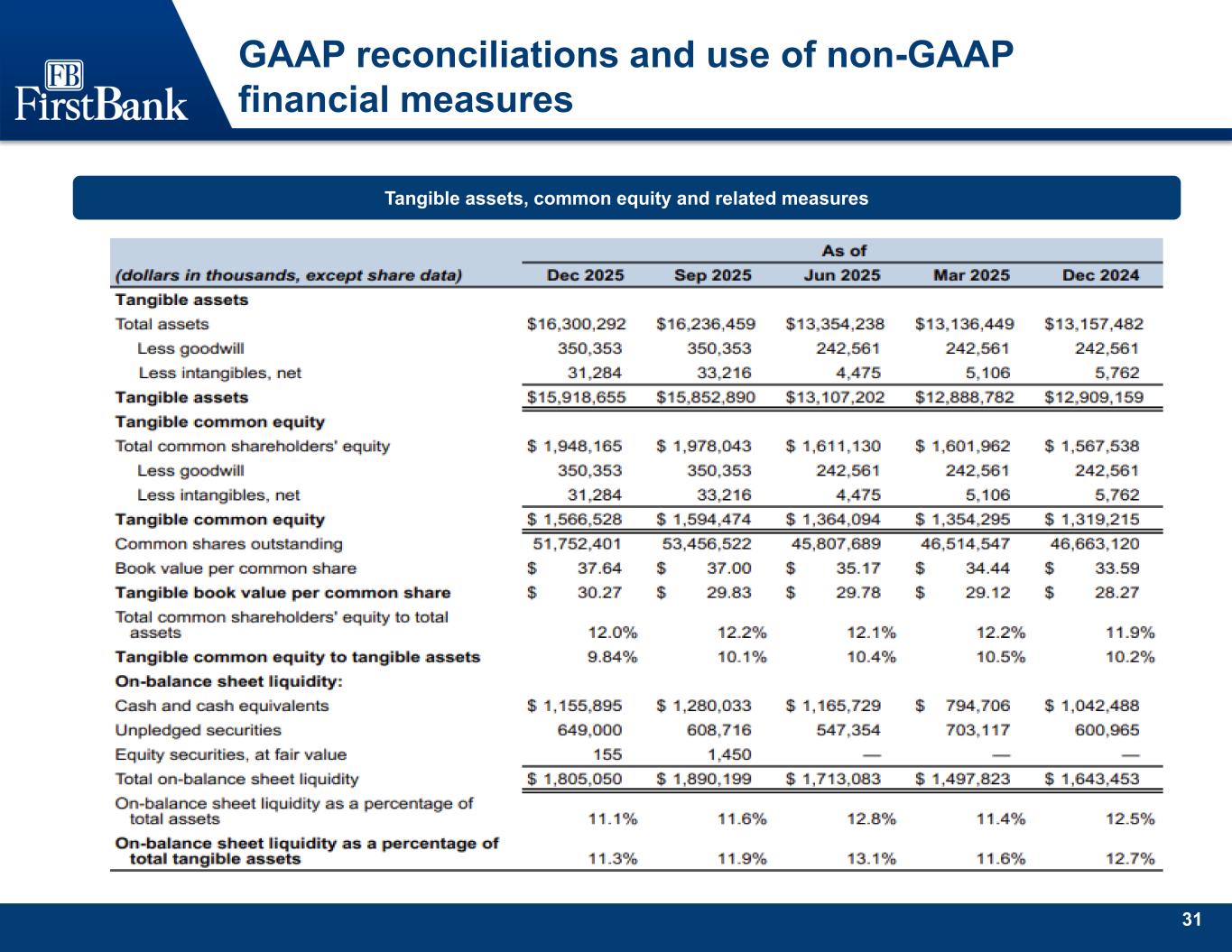 31 GAAP reconciliations and use of non-GAAP financial measures Tangible assets, common equity and related measures