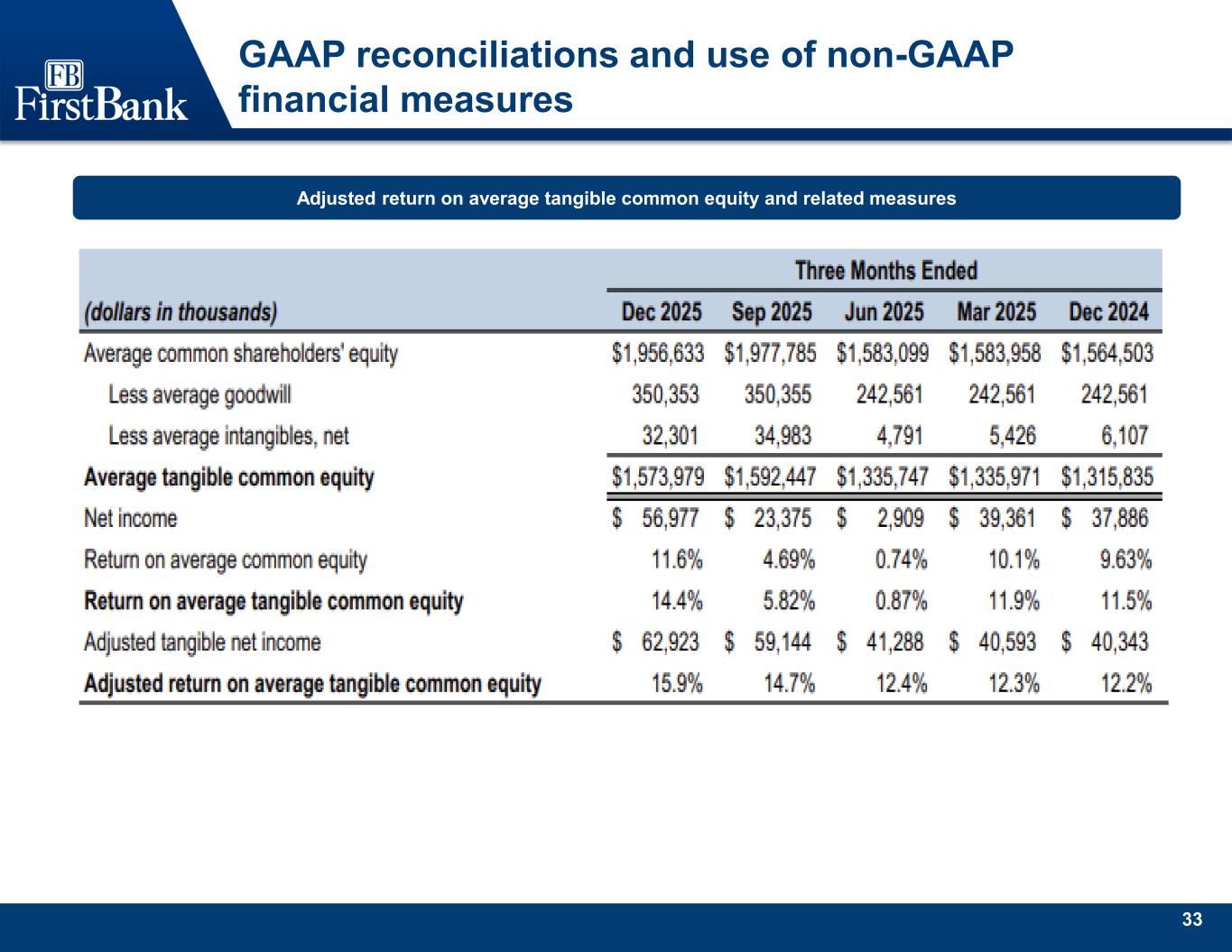 33 GAAP reconciliations and use of non-GAAP financial measures Adjusted return on average tangible common equity and related measures