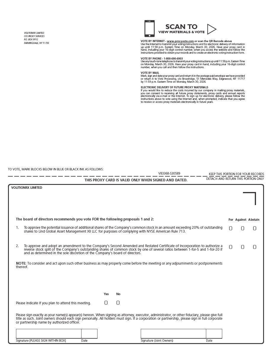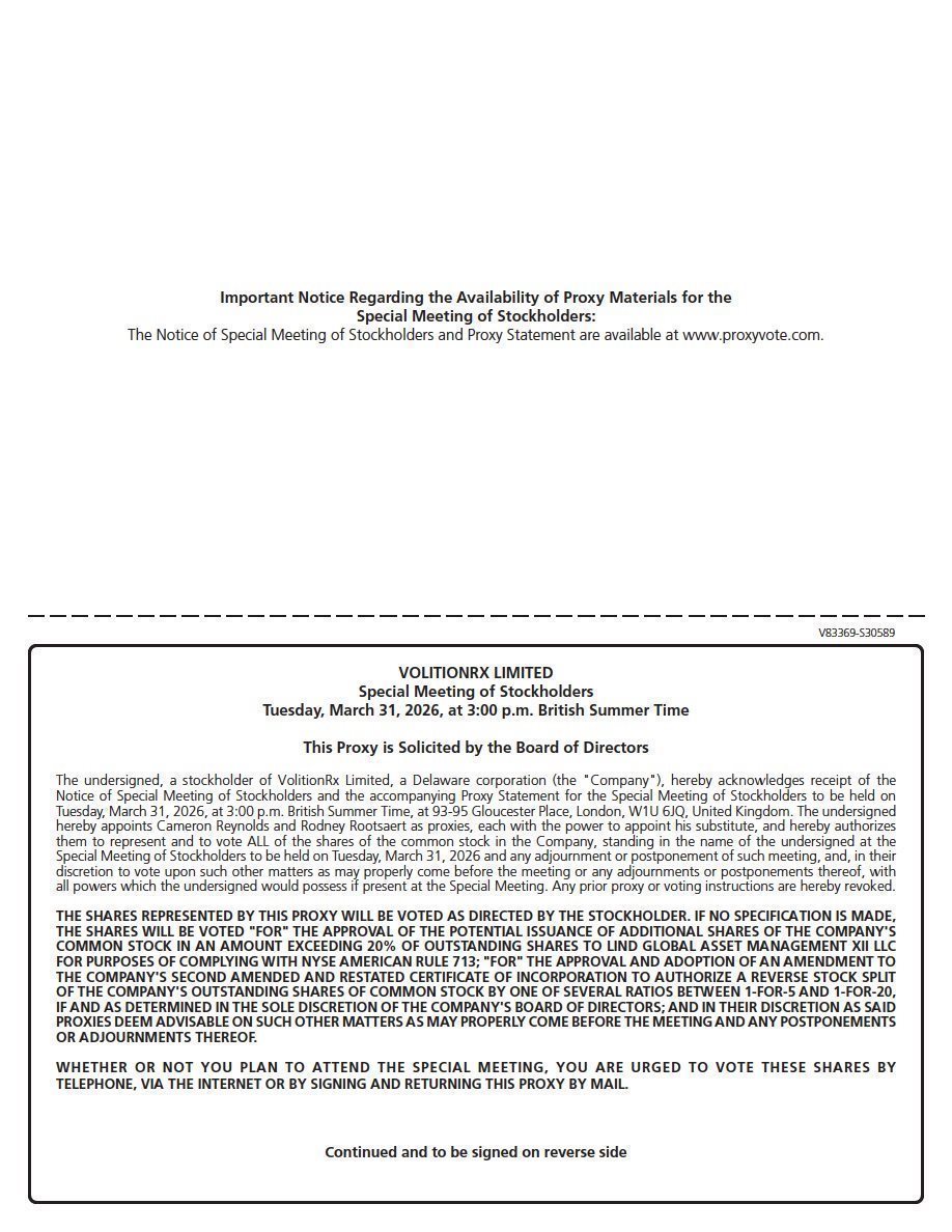 Notice is hereby given that a Special Meeting of Stockholders, or the Special Meeting, of VolitionRx Limited, which we refer to as VolitionRx, the Company, we or us, will be held at 93-95 Gloucester Place, London, W1U 6JQ, United Kingdom, at 3:00 p.m. British Summer Time on March 31, 2026, for the following purposes: