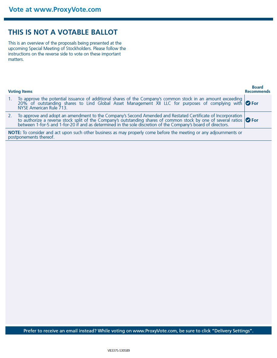 | 1. | Approval of issuing shares in excess of 20% of our outstanding shares. To approve the issuance of additional shares of our common stock in an amount exceeding 20% of outstanding shares to Lind Global Asset Management XII LLC for purposes of complying with NYSE American Rule 713. |