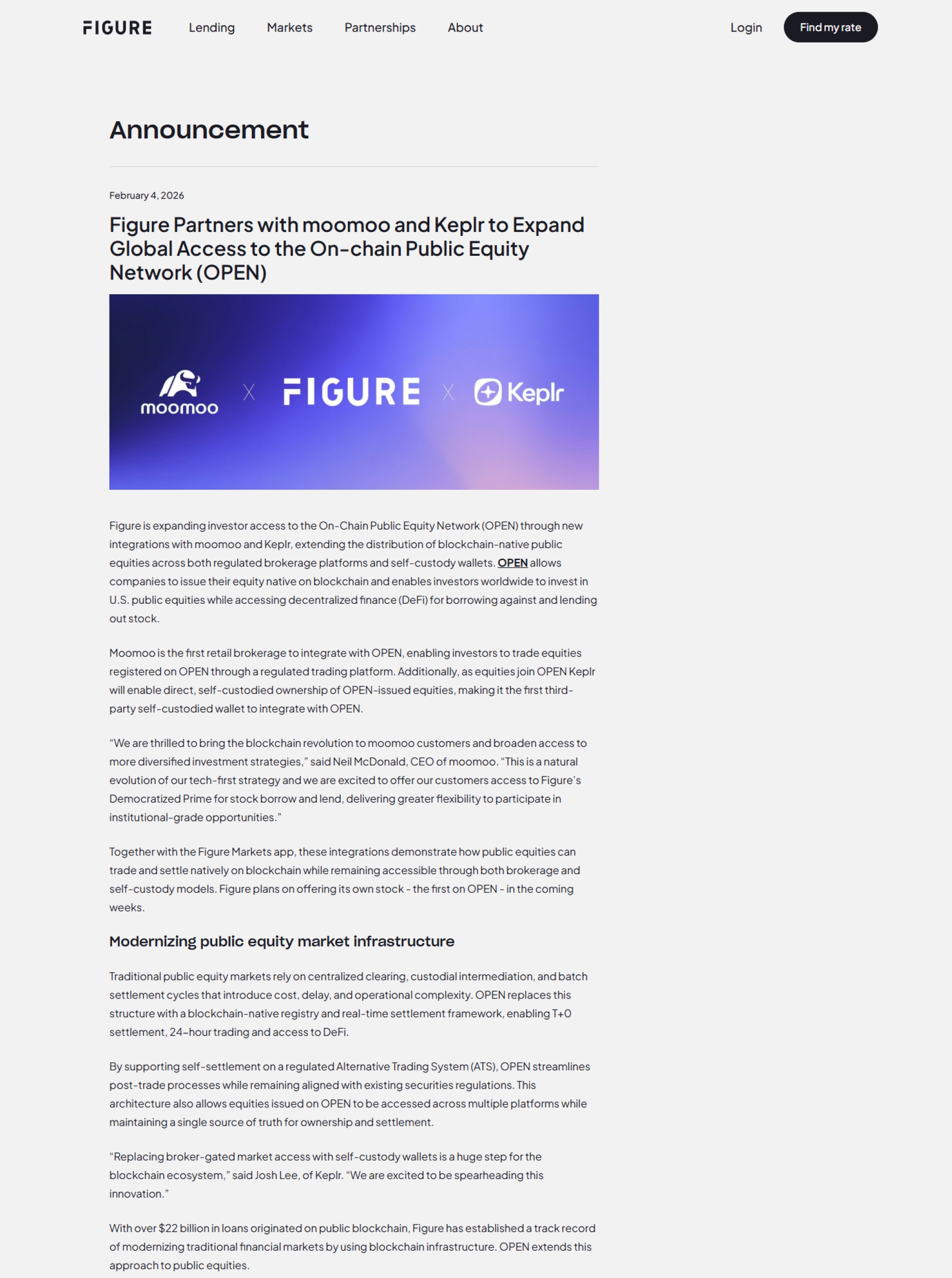 Figure is expanding investor access to the On-Chain Public Equity Network (OPEN) through new integrations with Moomoo and Keplr, extending the distribution of blockchain-native public equities across both regulated brokerage platforms and self-custody wallets. OPEN allows companies to issue their equity native on blockchain and enables investors worldwide to invest in U.S. public equities while accessing decentralized finance (DeFi) for borrowing against and lending out stock.