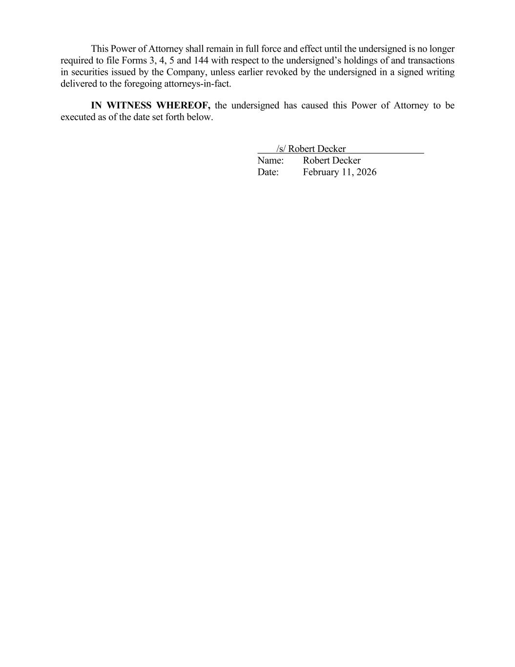 This Power of Attorney shall remain in full force and effect until the undersigned is no longer required to file Forms 3, 4, 5 and 144 with respect to the undersigned’s holdings of and transactions in securities issued by the Company, unless earlier revoked by the undersigned in a signed writing delivered to the foregoing attorneys-in-fact. IN WITNESS WHEREOF, the undersigned has caused this Power of Attorney to be executed as of the date set forth below. /s/ Robert Decker Name: Robert Decker Date: February 11, 2026