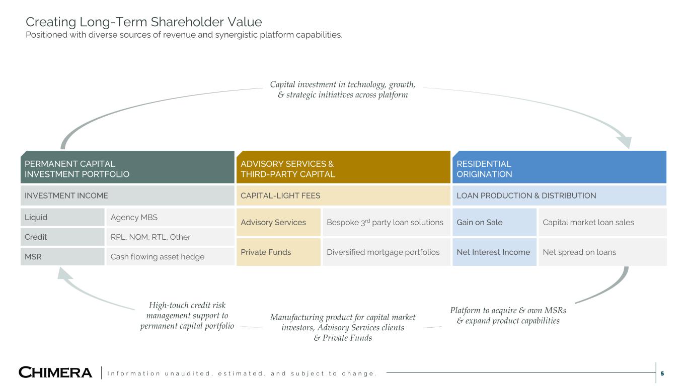 I n f o r m a t i o n u n a u d i t e d , e s t i m a t e d , a n d s u b j e c t t o c h a n g e . 4 HYBRID INVESTMENT APPROACH Invests across the spectrum of mortgage products, including residential loans, mortgage securities and servicing rights. Team expertise and robust infrastructure enable a disciplined approach to delivering value across the residential continuum. SCALED MORTGAGE CREDIT PLATFORM Risk management approach emphasizes asset-level credit risk management. Data management capabilities and proprietary technologies drive efficiencies in process, risk monitoring and credit decisions. RESIDENTIAL ORIGINATION Specialty mortgage lender focused primarily on providing consumer non-QM and investor business purpose loan solutions. National footprint supporting a network of mortgage bankers and brokers. THIRD-PARTY ASSET & INVESTMENT MANAGEMENT Bespoke asset management solutions for third-party institutional investors seeking exposure to residential loans. Manager of private asset-backed credit funds on behalf of institutional allocators. KEY STATISTICS As of December 31, 2025 2007 423 $6.6B $15.8B $2.6B $26.6B(1) Year Founded Full-Time Professionals Dividends Declared Since Inception Total Assets Shareholders’ Equity 3rd Party Managed Loans Chimera Investment Corp. We are a fully integrated hybrid mortgage REIT delivering diversified investment solutions across the mortgage product spectrum. Detailed endnotes are included within the Appendix at the end of this presentation.