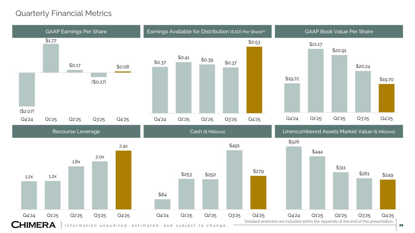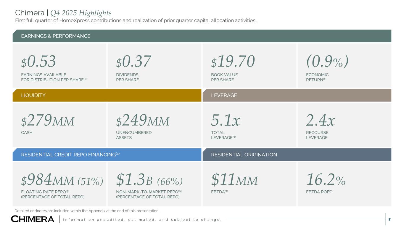 I n f o r m a t i o n u n a u d i t e d , e s t i m a t e d , a n d s u b j e c t t o c h a n g e . 7 EARNINGS & PERFORMANCE $0.53 EARNINGS AVAILABLE FOR DISTRIBUTION PER SHARE(1) $0.37 DIVIDENDS PER SHARE $19.70 BOOK VALUE PER SHARE (0.9%) ECONOMIC RETURN(2) LIQUIDITY LEVERAGE $279MM CASH $249MM UNENCUMBERED ASSETS 5.1x TOTAL LEVERAGE(3) 2.4x RECOURSE LEVERAGE RESIDENTIAL CREDIT REPO FINANCING(4) RESIDENTIAL ORIGINATION $984MM (51%) FLOATING RATE REPO(5) (PERCENTAGE OF TOTAL REPO) $1.3B (66%) NON-MARK-TO-MARKET REPO(6) (PERCENTAGE OF TOTAL REPO) $11MM EBTDA(7) 16.2% EBTDA ROE(7) Chimera | Q4 2025 Highlights First full quarter of HomeXpress contributions and realization of prior quarter capital allocation activities. Detailed endnotes are included within the Appendix at the end of this presentation.
