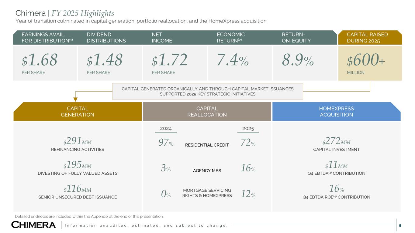 I n f o r m a t i o n u n a u d i t e d , e s t i m a t e d , a n d s u b j e c t t o c h a n g e . 8 Chimera | Q4 2025 Highlights Growth in earnings power provided the flexibility to announce a dividend increase along with 2026 expected dividend distributions. DIVIDEND INCREASE Announced increase in dividend to $0.45 per share in Q1 2026 (from $0.37). Expect to maintain $0.45 per share for the remainder of 2026. BOOK VALUE $19.70 book value per share, down 2.7% compared to $20.24 in Q3 2025. Change attributable in large part to the increase in value of securitized debt and transaction expenses and HomeXpress acquisition. RESIDENTIAL ORIGINATION $11 million EBTDA(1) on $1.0 billion of production volume. 16.2% EBTDA ROE(2) contribution. RESIDENTIAL CREDIT Exercised redemption rights on CIM 2022-I1 securitization; sold $166 million of underlying loans and generated $28 million in capital. Sold approximately $33 million of legacy Non-Agency RMBS – releasing roughly $6.7 million of capital at a breakeven ROE of 7%. AGENCY MBS Added a net $606 million and ended the year with over $3 billion in Agency RMBS. Detailed endnotes are included within the Appendix at the end of this presentation.