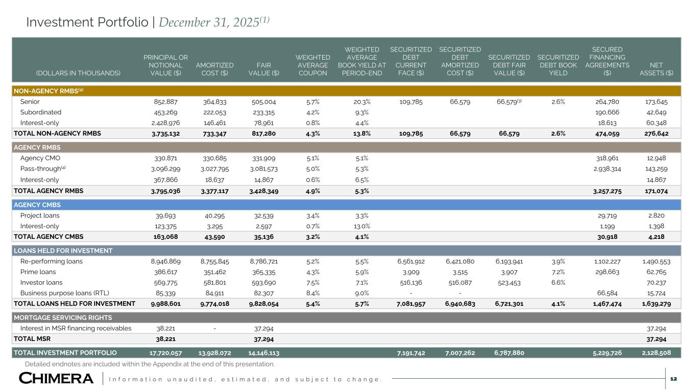 I n f o r m a t i o n u n a u d i t e d , e s t i m a t e d , a n d s u b j e c t t o c h a n g e . Investment Portfolio | December 31, 2025(1) 12 Detailed endnotes are included within the Appendix at the end of this presentation. (DOLLARS IN THOUSANDS) PRINCIPAL OR NOTIONAL VALUE ($) AMORTIZED COST ($) FAIR VALUE ($) WEIGHTED AVERAGE COUPON WEIGHTED AVERAGE BOOK YIELD AT PERIOD-END SECURITIZED DEBT CURRENT FACE ($) SECURITIZED DEBT AMORTIZED COST ($) SECURITIZED DEBT FAIR VALUE ($) SECURITIZED DEBT BOOK YIELD SECURED FINANCING AGREEMENTS ($) NET ASSETS ($) NON-AGENCY RMBS(2) Senior 852,887 364,833 505,004 5.7% 20.3% 109,785 66,579 66,579(3) 2.6% 264,780 173,645 Subordinated 453,269 222,053 233,315 4.2% 9.3% 190,666 42,649 Interest-only 2,428,976 146,461 78,961 0.8% 4.4% 18,613 60,348 TOTAL NON-AGENCY RMBS 3,735,132 733,347 817,280 4.3% 13.8% 109,785 66,579 66,579 2.6% 474,059 276,642 AGENCY RMBS Agency CMO 330,871 330,685 331,909 5.1% 5.1% 318,961 12,948 Pass-through(4) 3,096,299 3,027,795 3,081,573 5.0% 5.3% 2,938,314 143,259 Interest-only 367,866 18,637 14,867 0.6% 6.5% 14,867 TOTAL AGENCY RMBS 3,795,036 3,377,117 3,428,349 4.9% 5.3% 3,257,275 171,074 AGENCY CMBS Project loans 39,693 40,295 32,539 3.4% 3.3% 29,719 2,820 Interest-only 123,375 3,295 2,597 0.7% 13.0% 1,199 1,398 TOTAL AGENCY CMBS 163,068 43,590 35,136 3.2% 4.1% 30,918 4,218 LOANS HELD FOR INVESTMENT Re-performing loans 8,946,869 8,755,845 8,786,721 5.2% 5.5% 6,561,912 6,421,080 6,193,941 3.9% 1,102,227 1,490,553 Prime loans 386,617 351,462 365,335 4.3% 5.9% 3,909 3,515 3,907 7.2% 298,663 62,765 Investor loans 569,775 581,801 593,690 7.5% 7.1% 516,136 516,087 523,453 6.6% 70,237 Business purpose loans (RTL) 85,339 84,911 82,307 8.4% 9.0% - - 66,584 15,724 TOTAL LOANS HELD FOR INVESTMENT 9,988,601 9,774,018 9,828,054 5.4% 5.7% 7,081,957 6,940,683 6,721,301 4.1% 1,467,474 1,639,279 MORTGAGE SERVICING RIGHTS Interest in MSR financing receivables 38,221 - 37,294 37,294 TOTAL MSR 38,221 37,294 37,294 TOTAL INVESTMENT PORTFOLIO 17,720,057 13,928,072 14,146,113 7,191,742 7,007,262 6,787,880 5,229,726 2,128,508