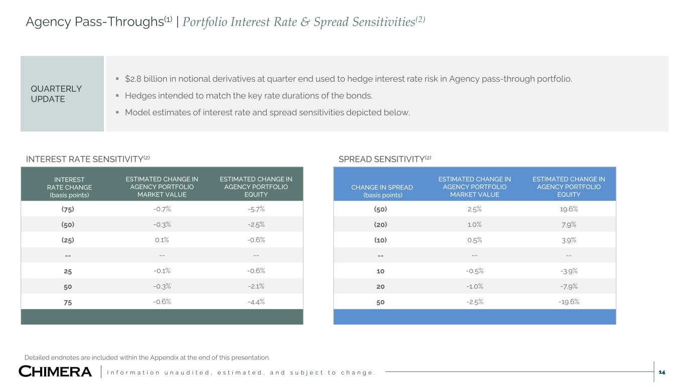 I n f o r m a t i o n u n a u d i t e d , e s t i m a t e d , a n d s u b j e c t t o c h a n g e . 13 Agency Pass-Throughs(1) | Portfolio Overview QUARTERLY UPDATE Added $606 million of notional in Agency pass-throughs (net purchases and sales). Leverage increased from 7.3x to 7.4x while maintaining key risk sensitivities within tolerances. 13% - 15% run rate levered returns. COUPON NOTIONAL ($MM) FAIR VALUE ($MM) % OF TOTAL EQUITY BUFFER (3) ($MM) REPO ($MM) PORTFOLIO EQUITY ($MM) PORTFOLIO LEVERAGE (DEBT/EQUITY) 3M ACTUAL CPR (4) 3M GENERIC CPR (4) 2.0% 13 11 0.3 1 10 2 5.8 3.4 4.1 3.0% 194 172 5.6 20 164 30 5.4 7.3 5.0 3.5% 53 49 1.6 6 47 8 5.6 9.5 6.0 4.0% 402 385 12.5 42 368 63 5.8 4.3 3.7 4.5% 304 298 9.7 30 284 46 6.2 7.2 2.5 5.0% 558 560 18.2 45 534 75 7.1 6.0 4.3 5.5% 1,260 1,286 41.7 74 1,226 141 8.7 10.5 13.7 6.0% 312 322 10.4 13 306 30 10.1 22.8 24.5 TOTAL 3,096 3,082 100 231 2,938 395 7.4 AGENCY PASS-THROUGH PORTFOLIO(1) SWAP TENOR (YEARS) NOTIONAL ($MM) WEIGHTED AVERAGE FIXED PAY RATE ≤ 1 300 3.5% > 1 to ≤ 3 1,144 3.3% > 3 to ≤ 5 409 3.5% > 5 to ≤ 7 279 3.4% > 7 to ≤ 10 252 3.7% > 10 to ≤ 15 210 3.8% > 15 to ≤ 20 135 3.9% > 20 75 3.9% TOTAL 2,804 3.5% AGENCY HEDGES(2) Detailed endnotes are included within the Appendix at the end of this presentation.