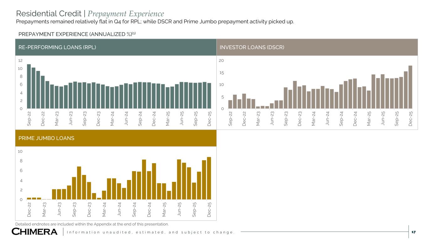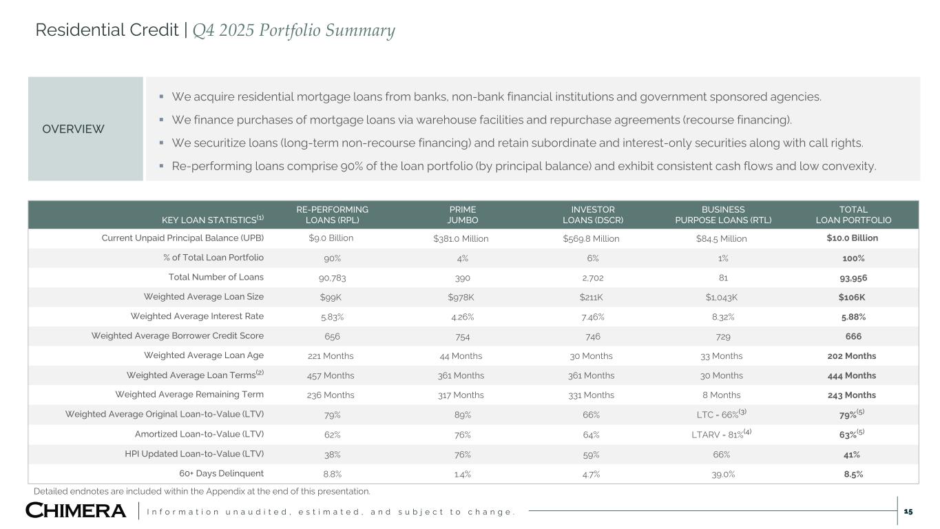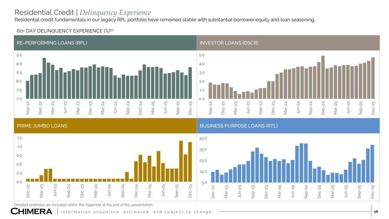 I n f o r m a t i o n u n a u d i t e d , e s t i m a t e d , a n d s u b j e c t t o c h a n g e . Residential Credit | Q4 2025 Portfolio Summary 15 OVERVIEW We acquire residential mortgage loans from banks, non-bank financial institutions and government sponsored agencies. We finance purchases of mortgage loans via warehouse facilities and repurchase agreements (recourse financing). We securitize loans (long-term non-recourse financing) and retain subordinate and interest-only securities along with call rights. Re-performing loans comprise 90% of the loan portfolio (by principal balance) and exhibit consistent cash flows and low convexity. Detailed endnotes are included within the Appendix at the end of this presentation. KEY LOAN STATISTICS(1) RE-PERFORMING LOANS (RPL) PRIME JUMBO INVESTOR LOANS (DSCR) BUSINESS PURPOSE LOANS (RTL) TOTAL LOAN PORTFOLIO Current Unpaid Principal Balance (UPB) $9.0 Billion $381.0 Million $569.8 Million $84.5 Million $10.0 Billion % of Total Loan Portfolio 90% 4% 6% 1% 100% Total Number of Loans 90,783 390 2,702 81 93,956 Weighted Average Loan Size $99K $978K $211K $1,043K $106K Weighted Average Interest Rate 5.83% 4.26% 7.46% 8.32% 5.88% Weighted Average Borrower Credit Score 656 754 746 729 666 Weighted Average Loan Age 221 Months 44 Months 30 Months 33 Months 202 Months Weighted Average Loan Terms(2) 457 Months 361 Months 361 Months 30 Months 444 Months Weighted Average Remaining Term 236 Months 317 Months 331 Months 8 Months 243 Months Weighted Average Original Loan-to-Value (LTV) 79% 89% 66% LTC = 66%(3) 79%(5) Amortized Loan-to-Value (LTV) 62% 76% 64% LTARV = 81%(4) 63%(5) HPI Updated Loan-to-Value (LTV) 38% 76% 59% 66% 41% 60+ Days Delinquent 8.8% 1.4% 4.7% 39.0% 8.5%