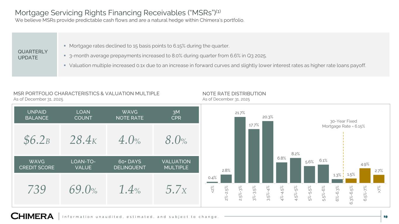 I n f o r m a t i o n u n a u d i t e d , e s t i m a t e d , a n d s u b j e c t t o c h a n g e . 19 Mortgage Servicing Rights Financing Receivables (“MSRs”)(1) We believe MSRs provide predictable cash flows and are a natural hedge within Chimera’s portfolio. MSR PORTFOLIO CHARACTERISTICS & VALUATION MULTIPLE As of December 31, 2025 QUARTERLY UPDATE Mortgage rates declined to 15 basis points to 6.15% during the quarter. 3-month average prepayments increased to 8.0% during quarter from 6.6% in Q3 2025. Valuation multiple increased 0.1x due to an increase in forward curves and slightly lower interest rates as higher rate loans payoff. UNPAID BALANCE LOAN COUNT WAVG NOTE RATE 3M CPR $6.2B 28.4K 4.0% 8.0% WAVG CREDIT SCORE LOAN-TO- VALUE 60+ DAYS DELINQUENT VALUATION MULTIPLE 739 69.0% 1.4% 5.7X 0.4% 2.8% 21.7% 17.7% 20.3% 6.8% 8.2% 5.6% 6.1% 1.3% 1.5% 4.9% 2.7% <2 % 2% -2 .5 % 2. 5% -3 % 3% -3 .5 % 3. 5% -4 % 4% -4 .5 % 4. 5% -5 % 5% -5 .5 % 5. 5% -6 % 6% -6 .3 % 6. 3% -6 .5 % 6. 5% -7 % >7 % NOTE RATE DISTRIBUTION As of December 31, 2025 30-Year Fixed Mortgage Rate = 6.15%