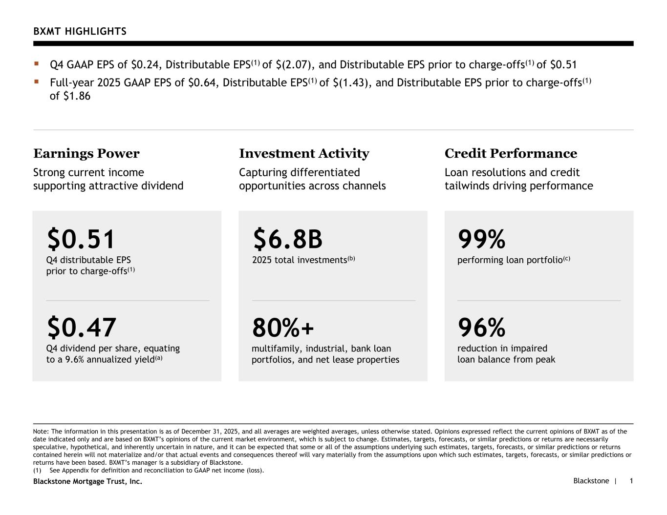 Blackstone |Blackstone Mortgage Trust, Inc. BXMT HIGHLIGHTS Note: The information in this presentation is as of December 31, 2025, and all averages are weighted averages, unless otherwise stated. Opinions expressed reflect the current opinions of BXMT as of the date indicated only and are based on BXMT’s opinions of the current market environment, which is subject to change. Estimates, targets, forecasts, or similar predictions or returns are necessarily speculative, hypothetical, and inherently uncertain in nature, and it can be expected that some or all of the assumptions underlying such estimates, targets, forecasts, or similar predictions or returns contained herein will not materialize and/or that actual events and consequences thereof will vary materially from the assumptions upon which such estimates, targets, forecasts, or similar predictions or returns have been based. BXMT’s manager is a subsidiary of Blackstone. (1) See Appendix for definition and reconciliation to GAAP net income (loss). 1 Q4 GAAP EPS of $0.24, Distributable EPS(1) of $(2.07), and Distributable EPS prior to charge-offs(1) of $0.51 Full-year 2025 GAAP EPS of $0.64, Distributable EPS(1) of $(1.43), and Distributable EPS prior to charge-offs(1) of $1.86 Earnings Power Strong current income supporting attractive dividend Investment Activity Capturing differentiated opportunities across channels Credit Performance Loan resolutions and credit tailwinds driving performance 99% performing loan portfolio(c) 96% reduction in impaired loan balance from peak $0.51 Q4 distributable EPS prior to charge-offs(1) $0.47 Q4 dividend per share, equating to a 9.6% annualized yield(a) $6.8B 2025 total investments(b) 80%+ multifamily, industrial, bank loan portfolios, and net lease properties