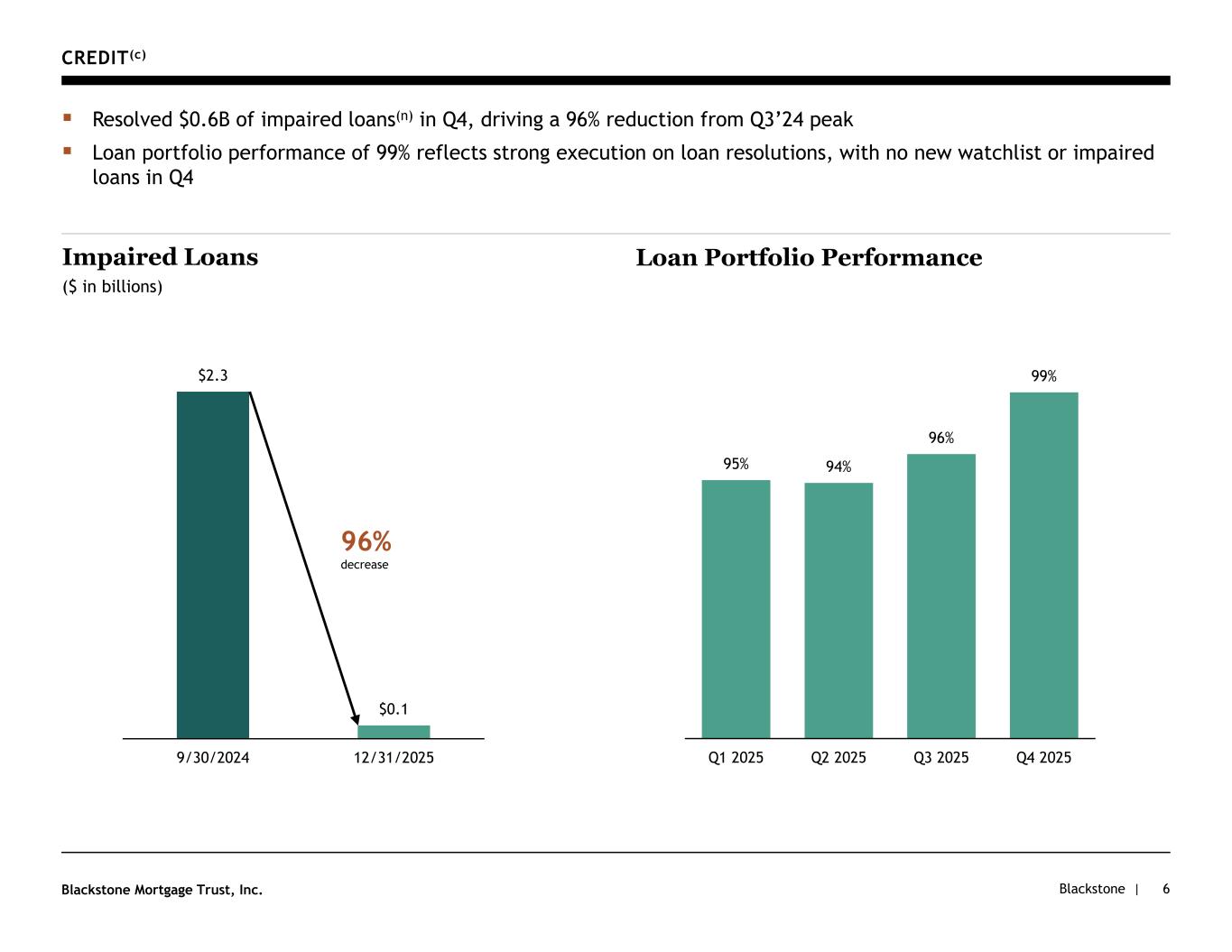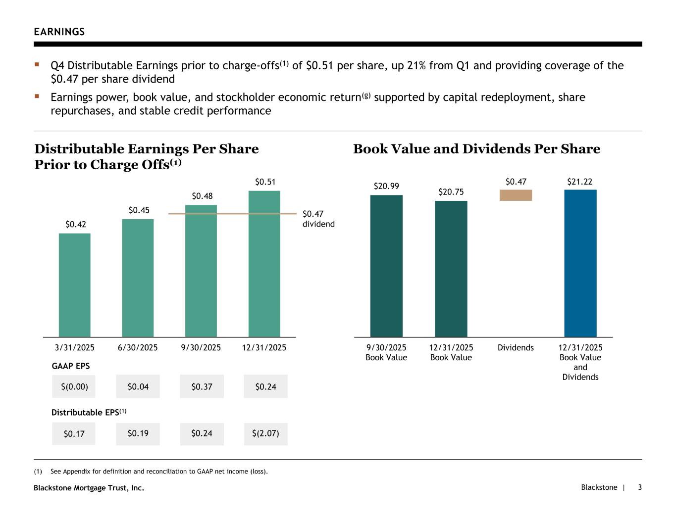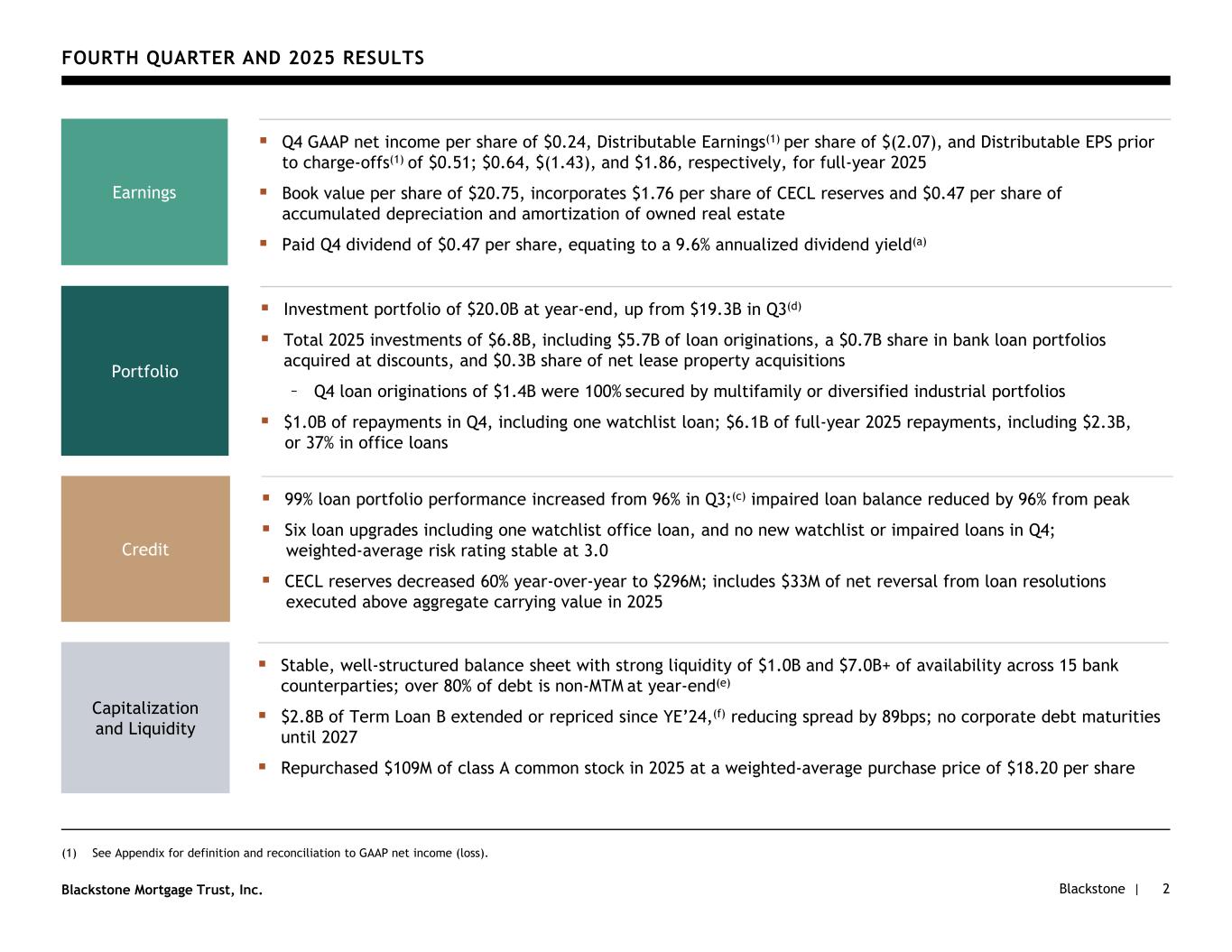 Blackstone |Blackstone Mortgage Trust, Inc. FOURTH QUARTER AND 2025 RESULTS (1) See Appendix for definition and reconciliation to GAAP net income (loss). 2 Q4 GAAP net income per share of $0.24, Distributable Earnings(1) per share of $(2.07), and Distributable EPS prior to charge-offs(1) of $0.51; $0.64, $(1.43), and $1.86, respectively, for full-year 2025 Book value per share of $20.75, incorporates $1.76 per share of CECL reserves and $0.47 per share of accumulated depreciation and amortization of owned real estate Paid Q4 dividend of $0.47 per share, equating to a 9.6% annualized dividend yield(a) Earnings Investment portfolio of $20.0B at year-end, up from $19.3B in Q3(d) Total 2025 investments of $6.8B, including $5.7B of loan originations, a $0.7B share in bank loan portfolios acquired at discounts, and $0.3B share of net lease property acquisitions – Q4 loan originations of $1.4B were 100% secured by multifamily or diversified industrial portfolios $1.0B of repayments in Q4, including one watchlist loan; $6.1B of full-year 2025 repayments, including $2.3B, or 37% in office loans Portfolio 99% loan portfolio performance increased from 96% in Q3;(c) impaired loan balance reduced by 96% from peak Six loan upgrades including one watchlist office loan, and no new watchlist or impaired loans in Q4; weighted-average risk rating stable at 3.0 CECL reserves decreased 60% year-over-year to $296M; includes $33M of net reversal from loan resolutions executed above aggregate carrying value in 2025 Credit Stable, well-structured balance sheet with strong liquidity of $1.0B and $7.0B+ of availability across 15 bank counterparties; over 80% of debt is non-MTM at year-end(e) $2.8B of Term Loan B extended or repriced since YE’24,(f) reducing spread by 89bps; no corporate debt maturities until 2027 Repurchased $109M of class A common stock in 2025 at a weighted-average purchase price of $18.20 per share Capitalization and Liquidity
