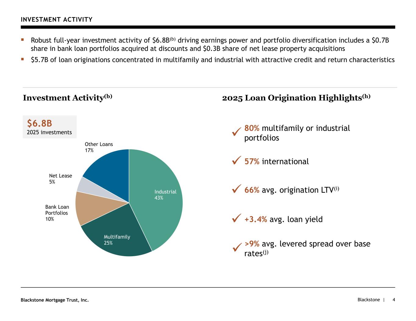 Blackstone |Blackstone Mortgage Trust, Inc. $0.42 $0.45 $0.48 $0.51 3/31/2025 6/30/2025 9/30/2025 12/31/2025 $20.99 $20.75 $21.22$0.47 9/30/2025 Book Value 12/31/2025 Book Value Dividends 12/31/2025 Book Value and Dividends EARNINGS Q4 Distributable Earnings prior to charge-offs(1) of $0.51 per share, up 21% from Q1 and providing coverage of the $0.47 per share dividend Earnings power, book value, and stockholder economic return(g) supported by capital redeployment, share repurchases, and stable credit performance (1) See Appendix for definition and reconciliation to GAAP net income (loss). Book Value and Dividends Per Share 3 Distributable Earnings Per Share Prior to Charge Offs(1) GAAP EPS $(0.00) $0.04 $0.37 Distributable EPS(1) $0.17 $0.19 $0.24 $0.24 $(2.07) $0.47 dividend