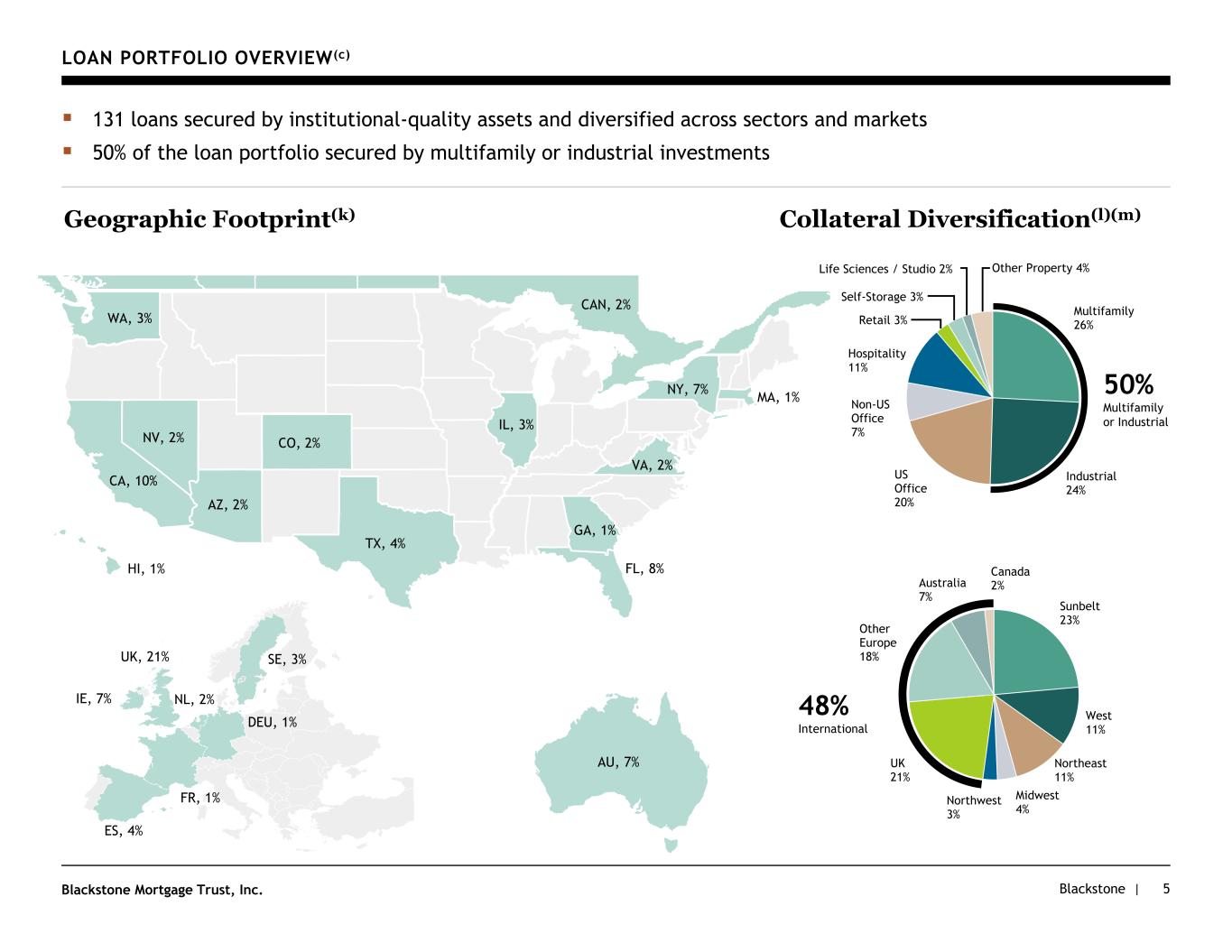 Blackstone |Blackstone Mortgage Trust, Inc. LOAN PORTFOLIO OVERVIEW(c) WA, 2% 48% International AU, 7% ES, 4% IE, 7% UK, 21% SE, 3% DEU, 1% TX, 4% NY, 7% NV, 2% MA, 1% IL, 3% GA, 1% FL, 8% CA, 10% VA, 2% AZ, 2% CO, 2% HI, 1% Geographic Footprint(k) CAN, 2% NL, 2% 131 loans secured by institutional-quality assets and diversified across sectors and markets 50% of the loan portfolio secured by multifamily or industrial investments Collateral Diversification(l)(m) Multifamily 26% Industrial 24% US Office 20% Non-US Office 7% Hospitality 11% Retail 3% Self-Storage 3% Life Sciences / Studio 2% Other Property 4% WA, 3% FR, 1% Sunbelt 23% West 11% Northeast 11% Midwest 4% Northwest 3% UK 21% Other Europe 18% Australia 7% Canada 2% 50% Multifamily or Industrial 5