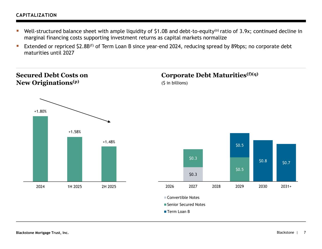 Blackstone |Blackstone Mortgage Trust, Inc. CAPITALIZATION 7 Well-structured balance sheet with ample liquidity of $1.0B and debt-to-equity(o) ratio of 3.9x; continued decline in marginal financing costs supporting investment returns as capital markets normalize Extended or repriced $2.8B(f) of Term Loan B since year-end 2024, reducing spread by 89bps; no corporate debt maturities until 2027 Corporate Debt Maturities(f)(q) ($ in billions) Secured Debt Costs on New Originations(p) $0.3 $0.3 $0.5 $0.5 $0.8 $0.7 2026 2027 2028 2029 2030 2031+ Convertible Notes Senior Secured Notes Term Loan B +1.80% +1.58% +1.48% 2024 1H 2025 2H 2025