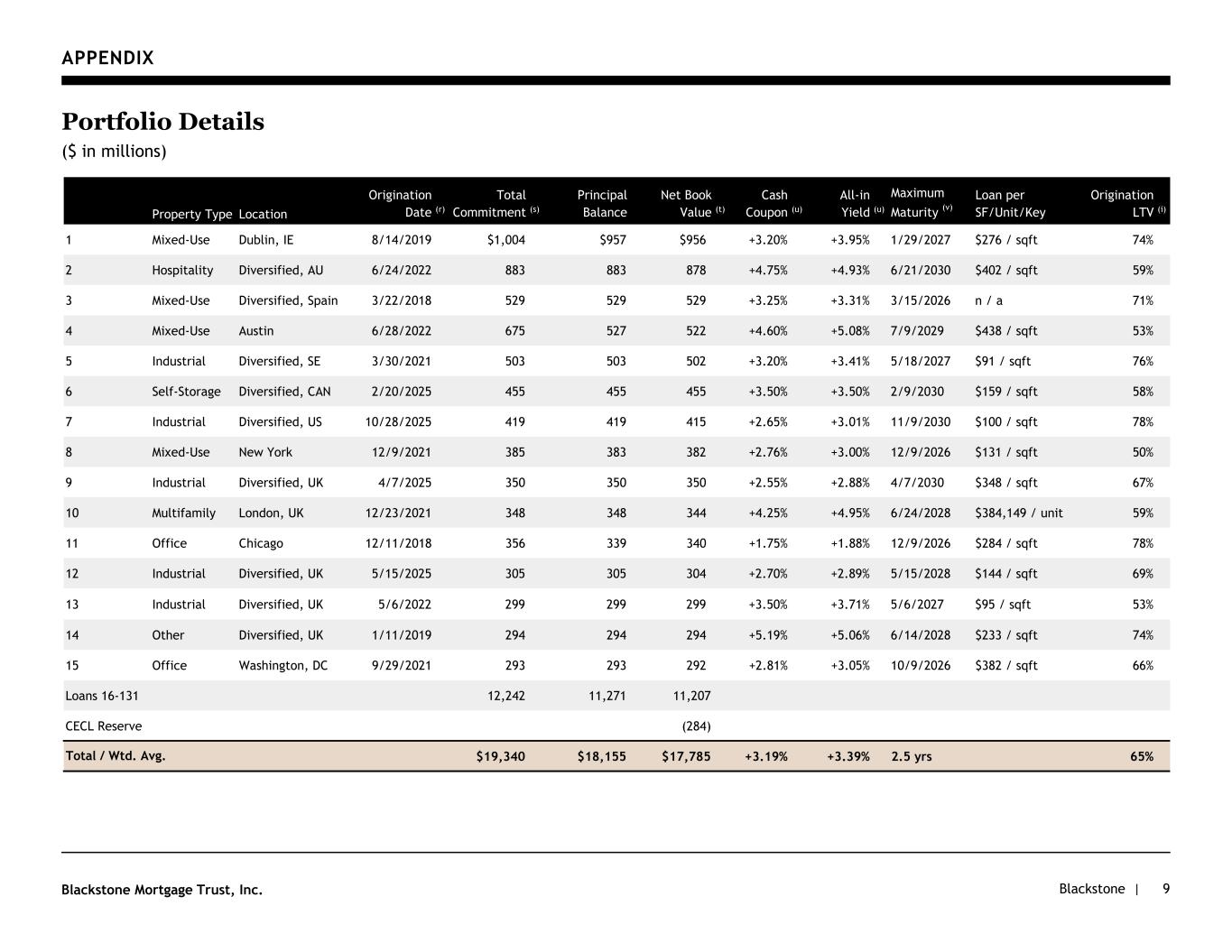 Blackstone |Blackstone Mortgage Trust, Inc. APPENDIX 9 Portfolio Details ($ in millions) Property Type Location Origination Date (r) Total Commitment (s) Principal Balance Net Book Value (t) Cash Coupon (u) All-in Yield (u) Maximum Maturity (v) Loan per SF/Unit/Key Origination LTV (i) 1 Mixed-Use Dublin, IE 8/14/2019 $1,004 $957 $956 +3.20% +3.95% 1/29/2027 $276 / sqft 74% 2 Hospitality Diversified, AU 6/24/2022 883 883 878 +4.75% +4.93% 6/21/2030 $402 / sqft 59% 3 Mixed-Use Diversified, Spain 3/22/2018 529 529 529 +3.25% +3.31% 3/15/2026 n / a 71% 4 Mixed-Use Austin 6/28/2022 675 527 522 +4.60% +5.08% 7/9/2029 $438 / sqft 53% 5 Industrial Diversified, SE 3/30/2021 503 503 502 +3.20% +3.41% 5/18/2027 $91 / sqft 76% 6 Self-Storage Diversified, CAN 2/20/2025 455 455 455 +3.50% +3.50% 2/9/2030 $159 / sqft 58% 7 Industrial Diversified, US 10/28/2025 419 419 415 +2.65% +3.01% 11/9/2030 $100 / sqft 78% 8 Mixed-Use New York 12/9/2021 385 383 382 +2.76% +3.00% 12/9/2026 $131 / sqft 50% 9 Industrial Diversified, UK 4/7/2025 350 350 350 +2.55% +2.88% 4/7/2030 $348 / sqft 67% 10 Multifamily London, UK 12/23/2021 348 348 344 +4.25% +4.95% 6/24/2028 $384,149 / unit 59% 11 Office Chicago 12/11/2018 356 339 340 +1.75% +1.88% 12/9/2026 $284 / sqft 78% 12 Industrial Diversified, UK 5/15/2025 305 305 304 +2.70% +2.89% 5/15/2028 $144 / sqft 69% 13 Industrial Diversified, UK 5/6/2022 299 299 299 +3.50% +3.71% 5/6/2027 $95 / sqft 53% 14 Other Diversified, UK 1/11/2019 294 294 294 +5.19% +5.06% 6/14/2028 $233 / sqft 74% 15 Office Washington, DC 9/29/2021 293 293 292 +2.81% +3.05% 10/9/2026 $382 / sqft 66% Loans 16-131 12,242 11,271 11,207 CECL Reserve (284) $19,340 $18,155 $17,785 +3.19% +3.39% 2.5 yrs 65%Total / Wtd. Avg.