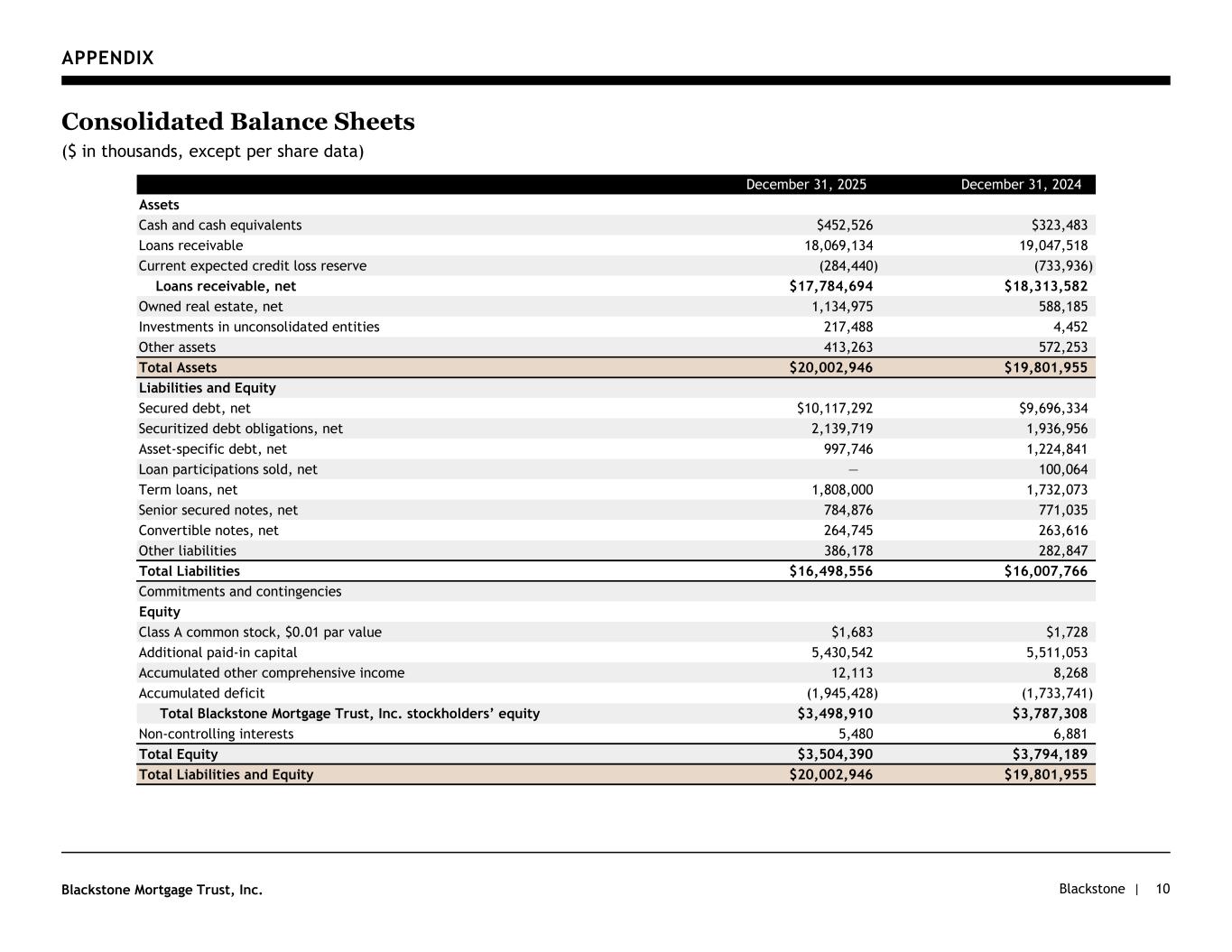 Blackstone |Blackstone Mortgage Trust, Inc. APPENDIX 10 Consolidated Balance Sheets ($ in thousands, except per share data) December 31, 2025 December 31, 2024 Assets Cash and cash equivalents $452,526 $323,483 Loans receivable 18,069,134 19,047,518 Current expected credit loss reserve (284,440) (733,936) Loans receivable, net $17,784,694 $18,313,582 Owned real estate, net 1,134,975 588,185 Investments in unconsolidated entities 217,488 4,452 Other assets 413,263 572,253 Total Assets $20,002,946 $19,801,955 Liabilities and Equity Secured debt, net $10,117,292 $9,696,334 Securitized debt obligations, net 2,139,719 1,936,956 Asset-specific debt, net 997,746 1,224,841 Loan participations sold, net — 100,064 Term loans, net 1,808,000 1,732,073 Senior secured notes, net 784,876 771,035 Convertible notes, net 264,745 263,616 Other liabilities 386,178 282,847 Total Liabilities $16,498,556 $16,007,766 Commitments and contingencies Equity Class A common stock, $0.01 par value $1,683 $1,728 Additional paid-in capital 5,430,542 5,511,053 Accumulated other comprehensive income 12,113 8,268 Accumulated deficit (1,945,428) (1,733,741) Total Blackstone Mortgage Trust, Inc. stockholders’ equity $3,498,910 $3,787,308 Non-controlling interests 5,480 6,881 Total Equity $3,504,390 $3,794,189 Total Liabilities and Equity $20,002,946 $19,801,955