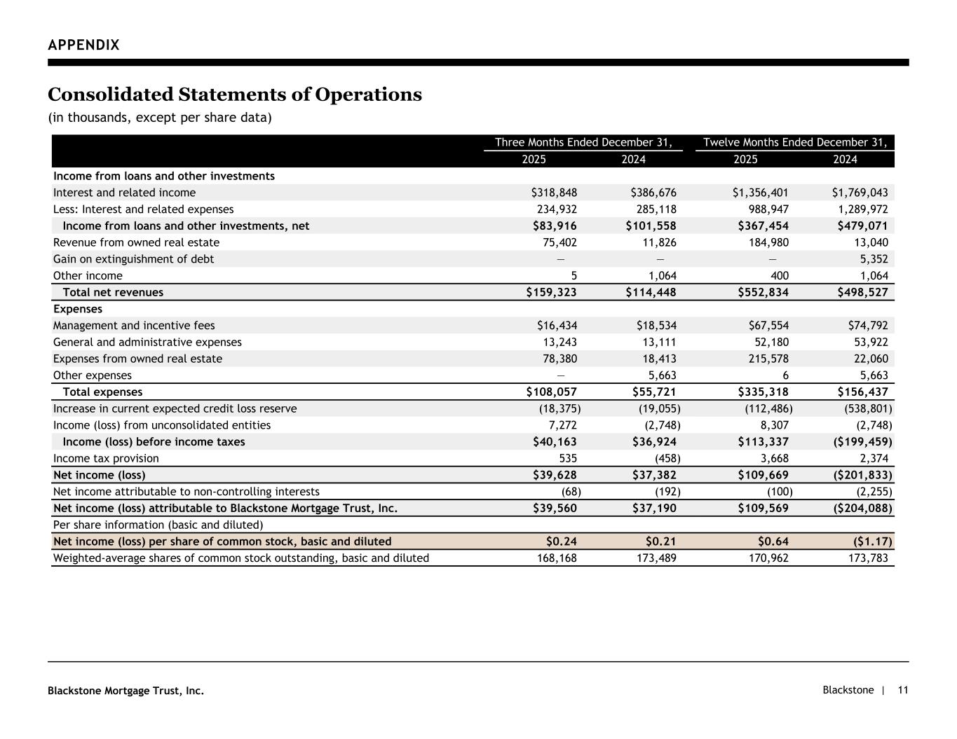 Blackstone |Blackstone Mortgage Trust, Inc. APPENDIX 11 Consolidated Statements of Operations (in thousands, except per share data) nice 2025 2024 2025 2024 Income from loans and other investments Interest and related income $318,848 $386,676 $1,356,401 $1,769,043 Less: Interest and related expenses 234,932 285,118 988,947 1,289,972 Income from loans and other investments, net $83,916 $101,558 $367,454 $479,071 Revenue from owned real estate 75,402 11,826 184,980 13,040 Gain on extinguishment of debt — — — 5,352 Other income 5 1,064 400 1,064 Total net revenues $159,323 $114,448 $552,834 $498,527 Expenses Management and incentive fees $16,434 $18,534 $67,554 $74,792 General and administrative expenses 13,243 13,111 52,180 53,922 Expenses from owned real estate 78,380 18,413 215,578 22,060 Other expenses — 5,663 6 5,663 Total expenses $108,057 $55,721 $335,318 $156,437 Increase in current expected credit loss reserve (18,375) (19,055) (112,486) (538,801) Income (loss) from unconsolidated entities 7,272 (2,748) 8,307 (2,748) Income (loss) before income taxes $40,163 $36,924 $113,337 ($199,459) Income tax provision 535 (458) 3,668 2,374 Net income (loss) $39,628 $37,382 $109,669 ($201,833) Net income attributable to non-controlling interests (68) (192) (100) (2,255) Net income (loss) attributable to Blackstone Mortgage Trust, Inc. $39,560 $37,190 $109,569 ($204,088) Per share information (basic and diluted) Net income (loss) per share of common stock, basic and diluted $0.24 $0.21 $0.64 ($1.17) Weighted-average shares of common stock outstanding, basic and diluted 168,168 173,489 170,962 173,783 Three Months Ended December 31, Twelve Months Ended December 31,