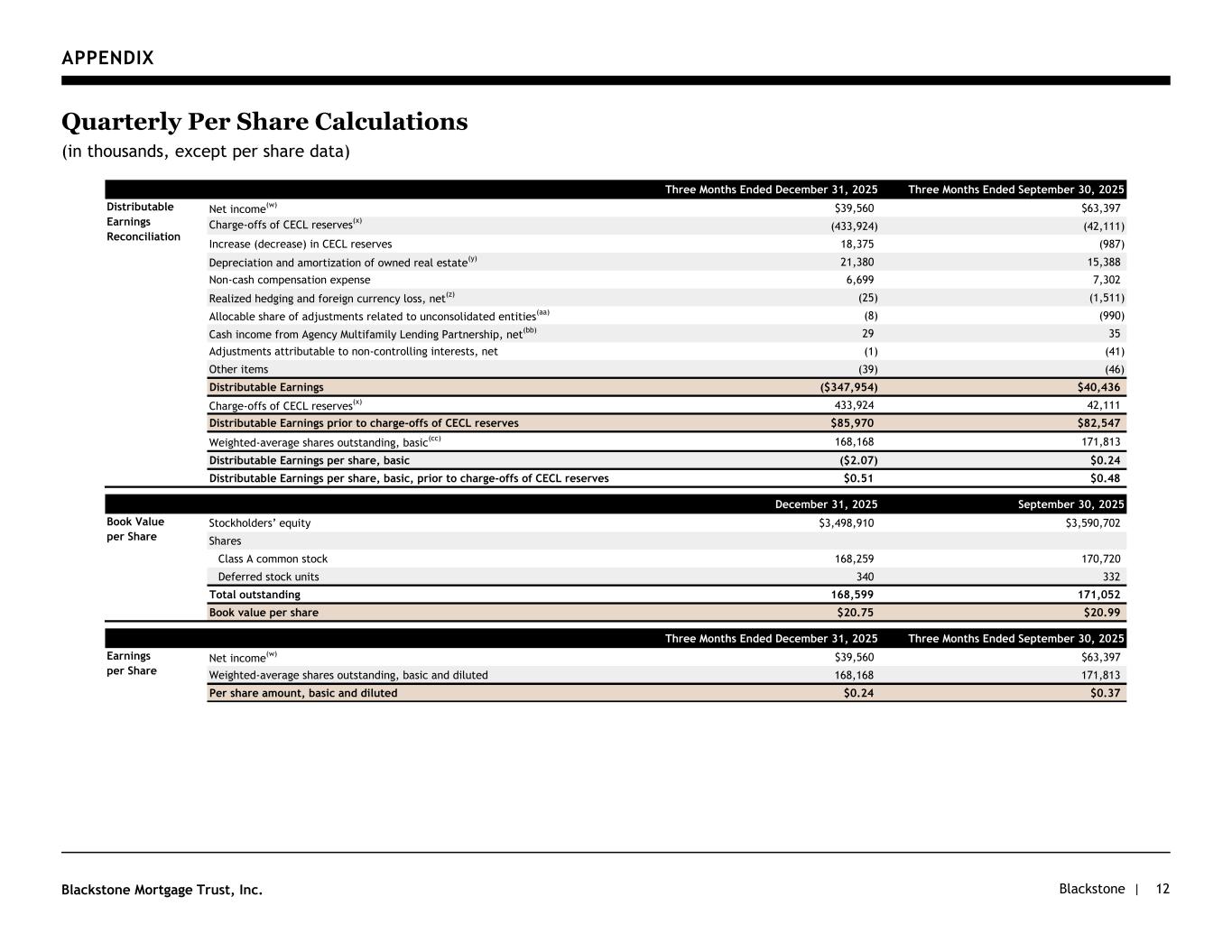 Blackstone |Blackstone Mortgage Trust, Inc. APPENDIX 12 Quarterly Per Share Calculations (in thousands, except per share data) Three Months Ended December 31, 2025 Three Months Ended September 30, 2025 Net income(w) $39,560 $63,397 Charge-offs of CECL reserves(x) (433,924) (42,111) Increase (decrease) in CECL reserves 18,375 (987) Depreciation and amortization of owned real estate(y) 21,380 15,388 Non-cash compensation expense 6,699 7,302 Realized hedging and foreign currency loss, net(z) (25) (1,511) Allocable share of adjustments related to unconsolidated entities(aa) (8) (990) Cash income from Agency Multifamily Lending Partnership, net(bb) 29 35 Adjustments attributable to non-controlling interests, net (1) (41) Other items (39) (46) Distributable Earnings ($347,954) $40,436 Charge-offs of CECL reserves(x) 433,924 42,111 Distributable Earnings prior to charge-offs of CECL reserves $85,970 $82,547 Weighted-average shares outstanding, basic(cc) 168,168 171,813 Distributable Earnings per share, basic ($2.07) $0.24 Distributable Earnings per share, basic, prior to charge-offs of CECL reserves $0.51 $0.48 December 31, 2025 September 30, 2025 Stockholders’ equity $3,498,910 $3,590,702 Shares Class A common stock 168,259 170,720 Deferred stock units 340 332 Total outstanding 168,599 171,052 Book value per share $20.75 $20.99 Three Months Ended December 31, 2025 Three Months Ended September 30, 2025 Net income(w) $39,560 $63,397 Weighted-average shares outstanding, basic and diluted 168,168 171,813 Per share amount, basic and diluted $0.24 $0.37 Distributable Earnings Reconciliation Book Value per Share Earnings per Share