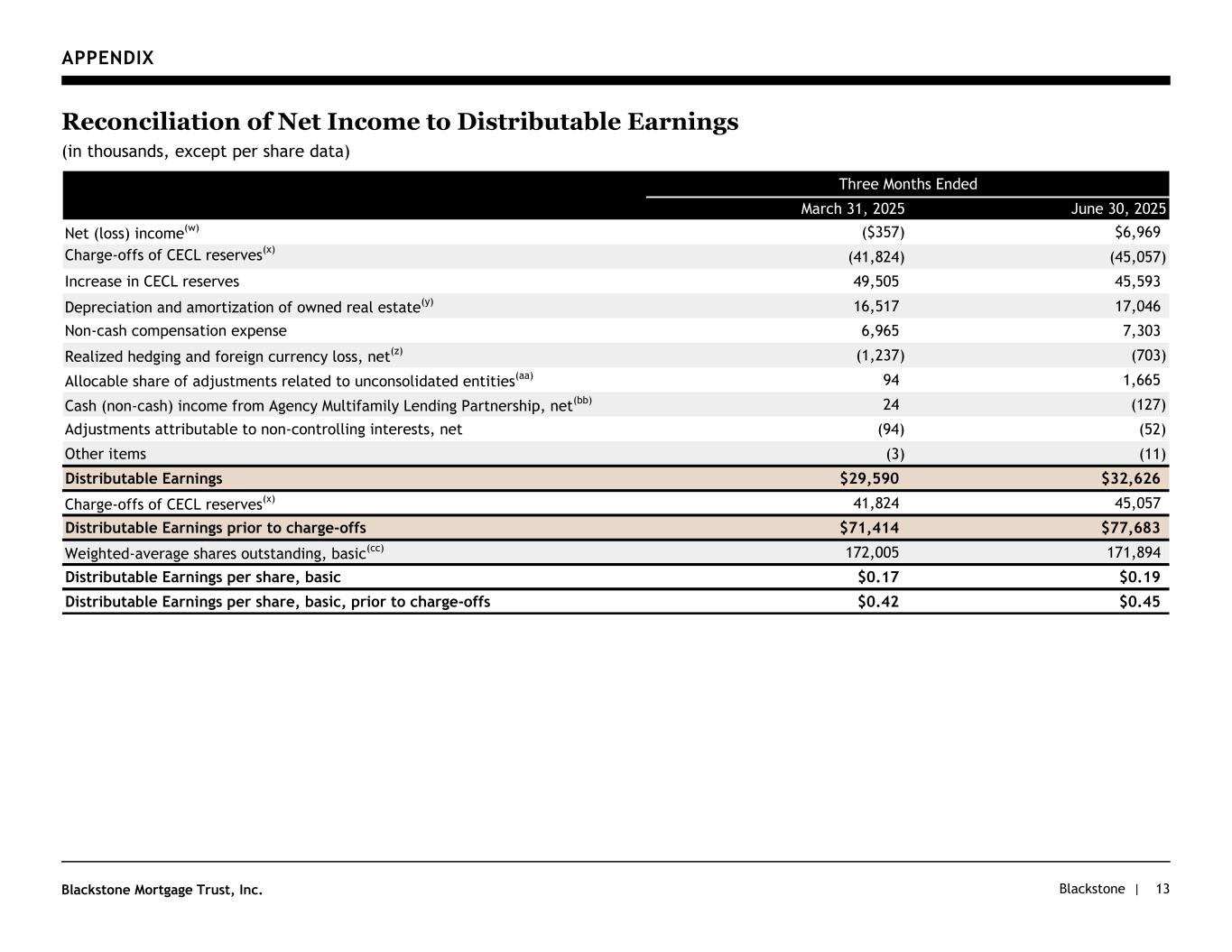 Blackstone |Blackstone Mortgage Trust, Inc. APPENDIX 13 Reconciliation of Net Income to Distributable Earnings (in thousands, except per share data) March 31, 2025 June 30, 2025 Net (loss) income(w) ($357) $6,969 Charge-offs of CECL reserves(x) (41,824) (45,057) Increase in CECL reserves 49,505 45,593 Depreciation and amortization of owned real estate(y) 16,517 17,046 Non-cash compensation expense 6,965 7,303 Realized hedging and foreign currency loss, net(z) (1,237) (703) Allocable share of adjustments related to unconsolidated entities(aa) 94 1,665 Cash (non-cash) income from Agency Multifamily Lending Partnership, net(bb) 24 (127) Adjustments attributable to non-controlling interests, net (94) (52) Other items (3) (11) Distributable Earnings $29,590 $32,626 Charge-offs of CECL reserves(x) 41,824 45,057 Distributable Earnings prior to charge-offs $71,414 $77,683 Weighted-average shares outstanding, basic(cc) 172,005 171,894 Distributable Earnings per share, basic $0.17 $0.19 Distributable Earnings per share, basic, prior to charge-offs $0.42 $0.45 Three Months Ended