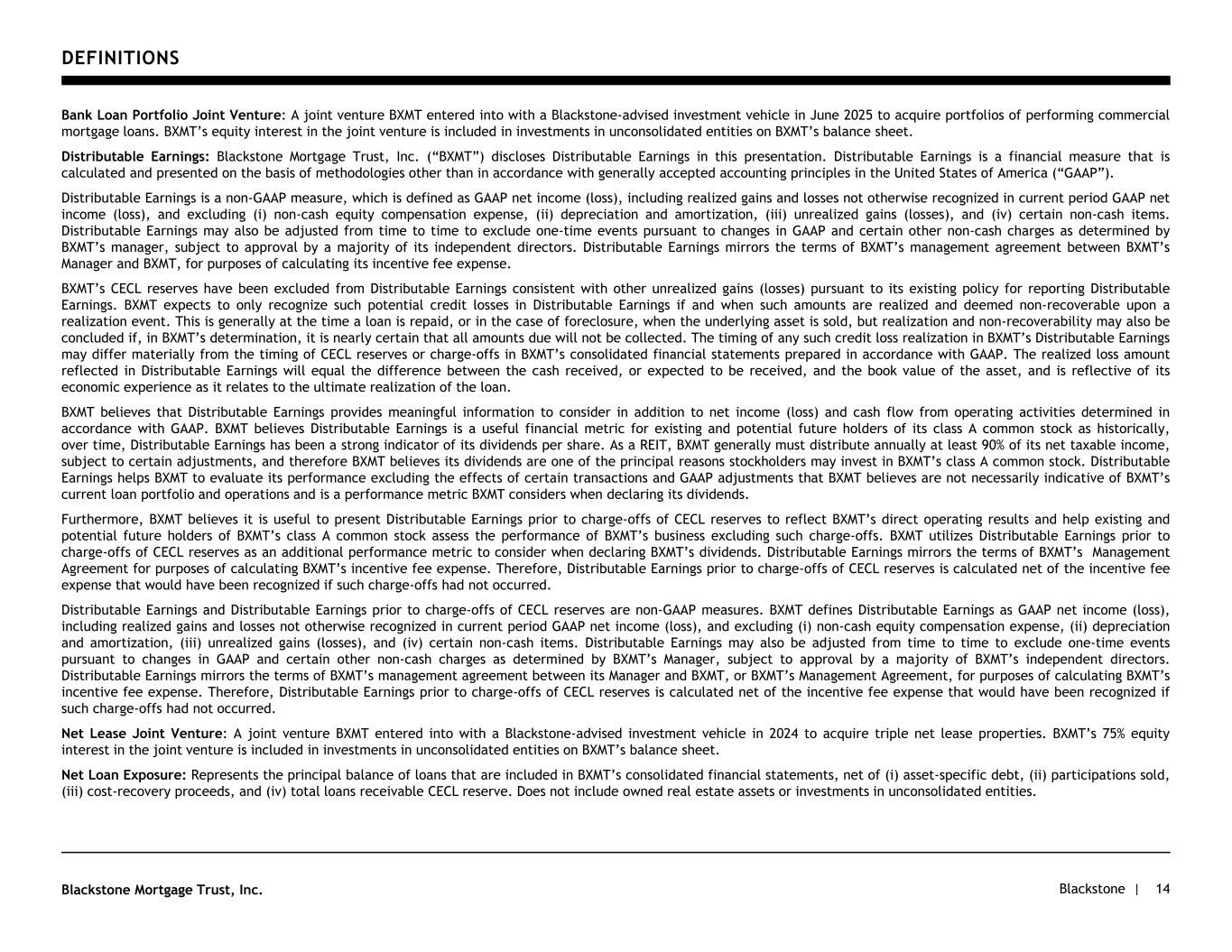 Blackstone |Blackstone Mortgage Trust, Inc. DEFINITIONS 14 Bank Loan Portfolio Joint Venture: A joint venture BXMT entered into with a Blackstone-advised investment vehicle in June 2025 to acquire portfolios of performing commercial mortgage loans. BXMT’s equity interest in the joint venture is included in investments in unconsolidated entities on BXMT’s balance sheet. Distributable Earnings: Blackstone Mortgage Trust, Inc. (“BXMT”) discloses Distributable Earnings in this presentation. Distributable Earnings is a financial measure that is calculated and presented on the basis of methodologies other than in accordance with generally accepted accounting principles in the United States of America (“GAAP”). Distributable Earnings is a non-GAAP measure, which is defined as GAAP net income (loss), including realized gains and losses not otherwise recognized in current period GAAP net income (loss), and excluding (i) non-cash equity compensation expense, (ii) depreciation and amortization, (iii) unrealized gains (losses), and (iv) certain non-cash items. Distributable Earnings may also be adjusted from time to time to exclude one-time events pursuant to changes in GAAP and certain other non-cash charges as determined by BXMT’s manager, subject to approval by a majority of its independent directors. Distributable Earnings mirrors the terms of BXMT’s management agreement between BXMT’s Manager and BXMT, for purposes of calculating its incentive fee expense. BXMT’s CECL reserves have been excluded from Distributable Earnings consistent with other unrealized gains (losses) pursuant to its existing policy for reporting Distributable Earnings. BXMT expects to only recognize such potential credit losses in Distributable Earnings if and when such amounts are realized and deemed non-recoverable upon a realization event. This is generally at the time a loan is repaid, or in the case of foreclosure, when the underlying asset is sold, but realization and non-recoverability may also be concluded if, in BXMT’s determination, it is nearly certain that all amounts due will not be collected. The timing of any such credit loss realization in BXMT’s Distributable Earnings may differ materially from the timing of CECL reserves or charge-offs in BXMT’s consolidated financial statements prepared in accordance with GAAP. The realized loss amount reflected in Distributable Earnings will equal the difference between the cash received, or expected to be received, and the book value of the asset, and is reflective of its economic experience as it relates to the ultimate realization of the loan. BXMT believes that Distributable Earnings provides meaningful information to consider in addition to net income (loss) and cash flow from operating activities determined in accordance with GAAP. BXMT believes Distributable Earnings is a useful financial metric for existing and potential future holders of its class A common stock as historically, over time, Distributable Earnings has been a strong indicator of its dividends per share. As a REIT, BXMT generally must distribute annually at least 90% of its net taxable income, subject to certain adjustments, and therefore BXMT believes its dividends are one of the principal reasons stockholders may invest in BXMT’s class A common stock. Distributable Earnings helps BXMT to evaluate its performance excluding the effects of certain transactions and GAAP adjustments that BXMT believes are not necessarily indicative of BXMT’s current loan portfolio and operations and is a performance metric BXMT considers when declaring its dividends. Furthermore, BXMT believes it is useful to present Distributable Earnings prior to charge-offs of CECL reserves to reflect BXMT’s direct operating results and help existing and potential future holders of BXMT’s class A common stock assess the performance of BXMT’s business excluding such charge-offs. BXMT utilizes Distributable Earnings prior to charge-offs of CECL reserves as an additional performance metric to consider when declaring BXMT’s dividends. Distributable Earnings mirrors the terms of BXMT’s Management Agreement for purposes of calculating BXMT’s incentive fee expense. Therefore, Distributable Earnings prior to charge-offs of CECL reserves is calculated net of the incentive fee expense that would have been recognized if such charge-offs had not occurred. Distributable Earnings and Distributable Earnings prior to charge-offs of CECL reserves are non-GAAP measures. BXMT defines Distributable Earnings as GAAP net income (loss), including realized gains and losses not otherwise recognized in current period GAAP net income (loss), and excluding (i) non-cash equity compensation expense, (ii) depreciation and amortization, (iii) unrealized gains (losses), and (iv) certain non-cash items. Distributable Earnings may also be adjusted from time to time to exclude one-time events pursuant to changes in GAAP and certain other non-cash charges as determined by BXMT’s Manager, subject to approval by a majority of BXMT’s independent directors. Distributable Earnings mirrors the terms of BXMT’s management agreement between its Manager and BXMT, or BXMT’s Management Agreement, for purposes of calculating BXMT’s incentive fee expense. Therefore, Distributable Earnings prior to charge-offs of CECL reserves is calculated net of the incentive fee expense that would have been recognized if such charge-offs had not occurred. Net Lease Joint Venture: A joint venture BXMT entered into with a Blackstone-advised investment vehicle in 2024 to acquire triple net lease properties. BXMT’s 75% equity interest in the joint venture is included in investments in unconsolidated entities on BXMT’s balance sheet. Net Loan Exposure: Represents the principal balance of loans that are included in BXMT’s consolidated financial statements, net of (i) asset-specific debt, (ii) participations sold, (iii) cost-recovery proceeds, and 
