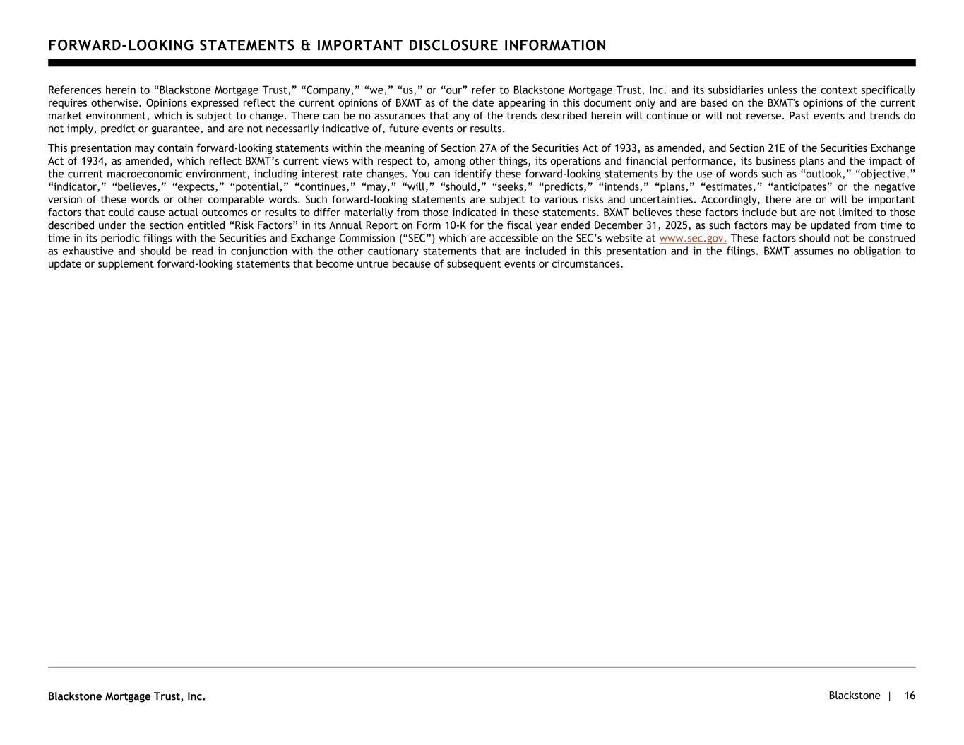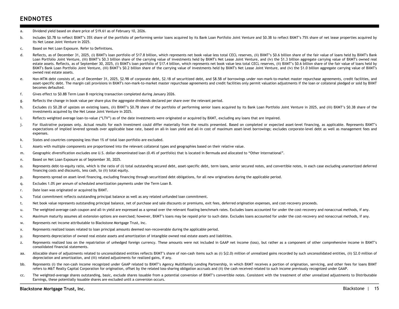 Blackstone |Blackstone Mortgage Trust, Inc. a. Dividend yield based on share price of $19.61 as of February 10, 2026. b. Includes $0.7B to reflect BXMT’s 35% share of the portfolio of performing senior loans acquired by its Bank Loan Portfolio Joint Venture and $0.3B to reflect BXMT’s 75% share of net lease properties acquired by its Net Lease Joint Venture in 2025. c. Based on Net Loan Exposure. Refer to Definitions. d. Reflects, as of December 31, 2025, (i) BXMT's loan portfolio of $17.8 billion, which represents net book value less total CECL reserves, (ii) BXMT’s $0.6 billion share of the fair value of loans held by BXMT's Bank Loan Portfolio Joint Venture, (iii) BXMT’s $0.3 billion share of the carrying value of investments held by BXMT's Net Lease Joint Venture, and (iv) the $1.3 billion aggregate carrying value of BXMT's owned real estate assets. Reflects, as of September 30, 2025, (i) BXMT's loan portfolio of $17.4 billion, which represents net book value less total CECL reserves, (ii) BXMT’s $0.6 billion share of the fair value of loans held by BXMT's Bank Loan Portfolio Joint Venture, (iii) BXMT’s $0.2 billion share of the carrying value of investments held by BXMT's Net Lease Joint Venture, and (iv) the $1.0 billion aggregate carrying value of BXMT's owned real estate assets. e. Non-MTM debt consists of, as of December 31, 2025, $2.9B of corporate debt, $2.1B of securitized debt, and $8.5B of borrowings under non-mark-to-market master repurchase agreements, credit facilities, and asset-specific debt. The margin call provisions in BXMT's non-mark-to-market master repurchase agreements and credit facilities only permit valuation adjustments if the loan or collateral pledged or sold by BXMT becomes defaulted. f. Gives effect to $0.8B Term Loan B repricing transaction completed during January 2026. g. Reflects the change in book value per share plus the aggregate dividends declared per share over the relevant period. h. Excludes (i) $0.2B of upsizes on existing loans, (ii) BXMT’s $0.7B share of the portfolio of performing senior loans acquired by its Bank Loan Portfolio Joint Venture in 2025, and (iii) BXMT’s $0.3B share of the investments acquired by the Net Lease Joint Venture in 2025. i. Reflects weighted average loan-to-value (“LTV”) as of the date investments were originated or acquired by BXMT, excluding any loans that are impaired. j. For illustrative purposes only. Actual results for each investment could differ materially from the results presented. Based on completed or expected asset-level financing, as applicable. Represents BXMT’s expectations of implied levered spreads over applicable base rate, based on all-in loan yield and all-in cost of maximum asset-level borrowings; excludes corporate-level debt as well as management fees and expenses. k. States and countries composing less than 1% of total loan portfolio are excluded. l. Assets with multiple components are proportioned into the relevant collateral types and geographies based on their relative value. m. Geographic diversification excludes one U.S. dollar-denominated loan (0.4% of portfolio) that is located in Bermuda and allocated to “Other International”. n. Based on Net Loan Exposure as of September 30, 2025. o. Represents debt-to-equity ratio, which is the ratio of (i) total outstanding secured debt, asset-specific debt, term loans, senior secured notes, and convertible notes, in each case excluding unamortized deferred financing costs and discounts, less cash, to (ii) total equity. p. Represents spread on asset-level financing, excluding financing through securitized debt obligations, for all new originations during the applicable period. q. Excludes 1.0% per annum of scheduled amortization payments under the Term Loan B. r. Date loan was originated or acquired by BXMT. s. Total commitment reflects outstanding principal balance as well as any related unfunded loan commitment. t. Net book value represents outstanding principal balance, net of purchase and sale discounts or premiums, exit fees, deferred origination expenses, and cost-recovery proceeds. u. The weighted-average cash coupon and all-in yield are expressed as a spread over the relevant floating benchmark rates. Excludes loans accounted for under the cost-recovery and nonaccrual methods, if any. v. Maximum maturity assumes all extension options are exercised; however, BXMT’s loans may be repaid prior to such date. Excludes loans accounted for under the cost-recovery and nonaccrual methods, if any. w. Represents net income attributable to Blackstone Mortgage Trust, Inc. x. Represents realized losses related to loan principal amounts deemed non-recoverable during the applicable period. y. Represents depreciation of owned real estate assets and amortization of intangible owned real estate assets and liabilities. z. Represents realized loss on the repatriation of unhedged foreign currency. These amounts were not included in GAAP net income (loss), but rather as a component of other comprehensive income in BXMT’s consolidated financial statements. aa. Allocable share of adjustments related to unconsolidated entities reflects BXMT’s share of non-cash items such as (i) $(2.0) million of unrealized gains recorded by such unconsolidated entities, (ii) $2.0 million of depreciation and amortization, and (iii) related adjustments for realized gains, if any. bb. Represents (i) the non-cash income recognized under GAAP related to BXMT’s Agency Multifamily Lending Partnership, in which BXMT receives a portion of origination, servicing, and other fees for loans BXMT refers to M&T Realty Capital Corporation for origination, offset by the related loss-sharing obligation accruals and (ii) the cash received related to such income previously recognized under GAAP. cc. The weighted-average shares outstanding, basic, exclude shares issuable from a potential conversion of BXMT’s convertible notes. Consistent with the treatment of other 