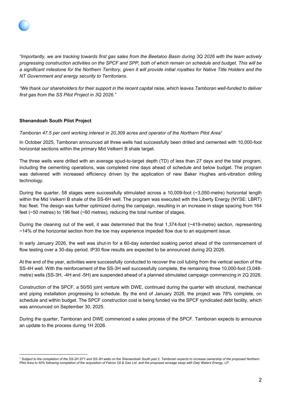 2 “Importantly, we are tracking towards first gas sales from the Beetaloo Basin during 3Q 2026 with the team actively progressing construction activities on the SPCF and SPP, both of which remain on schedule and budget. This will be a significant milestone for the Northern Territory, given it will provide initial royalties for Native Title Holders and the NT Government and energy security to Territorians. “We thank our shareholders for their support in the recent capital raise, which leaves Tamboran well-funded to deliver first gas from the SS Pilot Project in 3Q 2026.” Shenandoah South Pilot Project Tamboran 47.5 per cent working interest in 20,309 acres and operator of the Northern Pilot Area1 In October 2025, Tamboran announced all three wells had successfully been drilled and cemented with 10,000-foot horizontal sections within the primary Mid Velkerri B shale target. The three wells were drilled with an average spud-to-target depth (TD) of less than 27 days and the total program, including the cementing operations, was completed nine days ahead of schedule and below budget. The program was delivered with increased efficiency driven by the application of new Baker Hughes anti-vibration drilling technology. During the quarter, 58 stages were successfully stimulated across a 10,009-foot (~3,050-metre) horizontal length within the Mid Velkerri B shale of the SS-6H well. The program was executed with the Liberty Energy (NYSE: LBRT) frac fleet. The design was further optimized during the campaign, resulting in an increase in stage spacing from 164 feet (~50 metres) to 196 feet (~60 metres), reducing the total number of stages. During the cleaning out of the well, it was determined that the final 1,374-foot (~419-metre) section, representing ~14% of the horizontal section from the toe may experience impeded flow due to an equipment issue. In early January 2026, the well was shut-in for a 60-day extended soaking period ahead of the commencement of flow testing over a 30-day period. IP30 flow results are expected to be announced during 2Q 2026. At the end of the year, activities were successfully conducted to recover the coil tubing from the vertical section of the SS-4H well. With the reinforcement of the SS-3H well successfully complete, the remaining three 10,000-foot (3,048- metre) wells (SS-3H, -4H and -5H) are suspended ahead of a planned stimulated campaign commencing in 2Q 2026. Construction of the SPCF, a 50/50 joint venture with DWE, continued during the quarter with structural, mechanical and piping installation progressing to schedule. By the end of January 2026, the project was 78% complete, on schedule and within budget. The SPCF construction cost is being funded via the SPCF syndicated debt facility, which was announced on September 30, 2025. During the quarter, Tamboran and DWE commenced a sales process of the SPCF. Tamboran expects to announce an update to the process during 1H 2026. 1 Subject to the completion of the SS-2H ST1 and SS-3H wells on the Shenandoah South pad 2. Tamboran expects to increase ownership of the proposed Northern Pilot Area to 50% following completion of the acquisition of Falcon Oil & Gas Ltd. and the proposed acreage swap with Daly Waters Energy, LP.