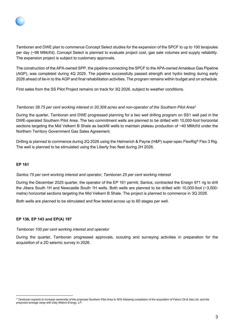 3 Tamboran and DWE plan to commence Concept Select studies for the expansion of the SPCF to up to 100 terajoules per day (~98 MMcf/d). Concept Select is planned to evaluate project cost, gas sale volumes and supply reliability. The expansion project is subject to customary approvals. The construction of the APA-owned SPP, the pipeline connecting the SPCF to the APA-owned Amadeus Gas Pipeline (AGP), was completed during 4Q 2025. The pipeline successfully passed strength and hydro testing during early 2026 ahead of tie-in to the AGP and final rehabilitation activities. The program remains within budget and on schedule. First sales from the SS Pilot Project remains on track for 3Q 2026, subject to weather conditions. Tamboran 38.75 per cent working interest in 20,309 acres and non-operator of the Southern Pilot Area2 During the quarter, Tamboran and DWE progressed planning for a two well drilling program on SS1 well pad in the DWE-operated Southern Pilot Area. The two commitment wells are planned to be drilled with 10,000-foot horizontal sections targeting the Mid Velkerri B Shale as backfill wells to maintain plateau production of ~40 MMcf/d under the Northern Territory Government Gas Sales Agreement. Drilling is planned to commence during 2Q 2026 using the Helmerich & Payne (H&P) super-spec FlexRig® Flex 3 Rig. The well is planned to be stimulated using the Liberty frac fleet during 2H 2026. EP 161 Santos 75 per cent working interest and operator, Tamboran 25 per cent working interest During the December 2025 quarter, the operator of the EP 161 permit, Santos, contracted the Ensign 971 rig to drill the Jibera South 1H and Newcastle South 1H wells. Both wells are planned to be drilled with 10,000-foot (~3,000- metre) horizontal sections targeting the Mid Velkerri B Shale. The project is planned to commence in 3Q 2026. Both wells are planned to be stimulated and flow tested across up to 60 stages per well. EP 136, EP 143 and EP(A) 197 Tamboran 100 per cent working interest and operator During the quarter, Tamboran progressed approvals, scouting and surveying activities in preparation for the acquisition of a 2D seismic survey in 2026. 2 Tamboran expects to increase ownership of the proposed Southern Pilot Area to 50% following completion of the acquisition of Falcon Oil & Gas Ltd. and the proposed acreage swap with Daly Waters Energy, LP.