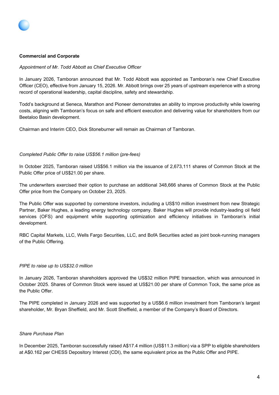 4 Commercial and Corporate Appointment of Mr. Todd Abbott as Chief Executive Officer In January 2026, Tamboran announced that Mr. Todd Abbott was appointed as Tamboran’s new Chief Executive Officer (CEO), effective from January 15, 2026. Mr. Abbott brings over 25 years of upstream experience with a strong record of operational leadership, capital discipline, safety and stewardship. Todd’s background at Seneca, Marathon and Pioneer demonstrates an ability to improve productivity while lowering costs, aligning with Tamboran’s focus on safe and efficient execution and delivering value for shareholders from our Beetaloo Basin development. Chairman and Interim CEO, Dick Stoneburner will remain as Chairman of Tamboran. Completed Public Offer to raise US$56.1 million (pre-fees) In October 2025, Tamboran raised US$56.1 million via the issuance of 2,673,111 shares of Common Stock at the Public Offer price of US$21.00 per share. The underwriters exercised their option to purchase an additional 348,666 shares of Common Stock at the Public Offer price from the Company on October 23, 2025. The Public Offer was supported by cornerstone investors, including a US$10 million investment from new Strategic Partner, Baker Hughes, a leading energy technology company. Baker Hughes will provide industry-leading oil field services (OFS) and equipment while supporting optimization and efficiency initiatives in Tamboran’s initial development. RBC Capital Markets, LLC, Wells Fargo Securities, LLC, and BofA Securities acted as joint book-running managers of the Public Offering. PIPE to raise up to US$32.0 million In January 2026, Tamboran shareholders approved the US$32 million PIPE transaction, which was announced in October 2025. Shares of Common Stock were issued at US$21.00 per share of Common Tock, the same price as the Public Offer. The PIPE completed in January 2026 and was supported by a US$6.6 million investment from Tamboran’s largest shareholder, Mr. Bryan Sheffield, and Mr. Scott Sheffield, a member of the Company’s Board of Directors. Share Purchase Plan In December 2025, Tamboran successfully raised A$17.4 million (US$11.3 million) via a SPP to eligible shareholders at A$0.162 per CHESS Depository Interest (CDI), the same equivalent price as the Public Offer and PIPE.