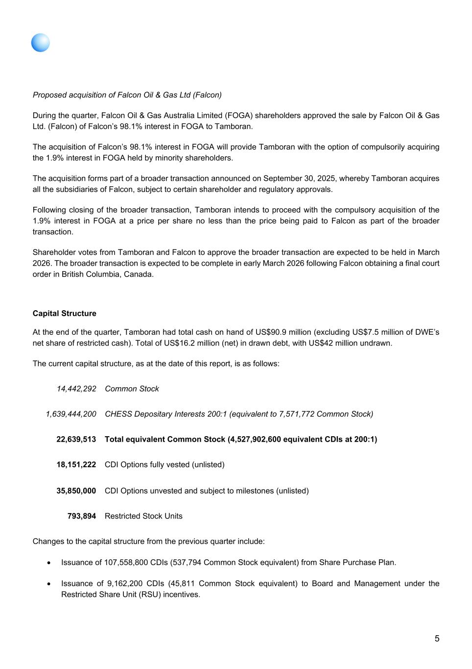 5 Proposed acquisition of Falcon Oil & Gas Ltd (Falcon) During the quarter, Falcon Oil & Gas Australia Limited (FOGA) shareholders approved the sale by Falcon Oil & Gas Ltd. (Falcon) of Falcon’s 98.1% interest in FOGA to Tamboran. The acquisition of Falcon’s 98.1% interest in FOGA will provide Tamboran with the option of compulsorily acquiring the 1.9% interest in FOGA held by minority shareholders. The acquisition forms part of a broader transaction announced on September 30, 2025, whereby Tamboran acquires all the subsidiaries of Falcon, subject to certain shareholder and regulatory approvals. Following closing of the broader transaction, Tamboran intends to proceed with the compulsory acquisition of the 1.9% interest in FOGA at a price per share no less than the price being paid to Falcon as part of the broader transaction. Shareholder votes from Tamboran and Falcon to approve the broader transaction are expected to be held in March 2026. The broader transaction is expected to be complete in early March 2026 following Falcon obtaining a final court order in British Columbia, Canada. Capital Structure At the end of the quarter, Tamboran had total cash on hand of US$90.9 million (excluding US$7.5 million of DWE’s net share of restricted cash). Total of US$16.2 million (net) in drawn debt, with US$42 million undrawn. The current capital structure, as at the date of this report, is as follows: 14,442,292 Common Stock 1,639,444,200 CHESS Depositary Interests 200:1 (equivalent to 7,571,772 Common Stock) 22,639,513 Total equivalent Common Stock (4,527,902,600 equivalent CDIs at 200:1) 18,151,222 CDI Options fully vested (unlisted) 35,850,000 CDI Options unvested and subject to milestones (unlisted) 793,894 Restricted Stock Units Changes to the capital structure from the previous quarter include: • Issuance of 107,558,800 CDIs (537,794 Common Stock equivalent) from Share Purchase Plan. • Issuance of 9,162,200 CDIs (45,811 Common Stock equivalent) to Board and Management under the Restricted Share Unit (RSU) incentives.