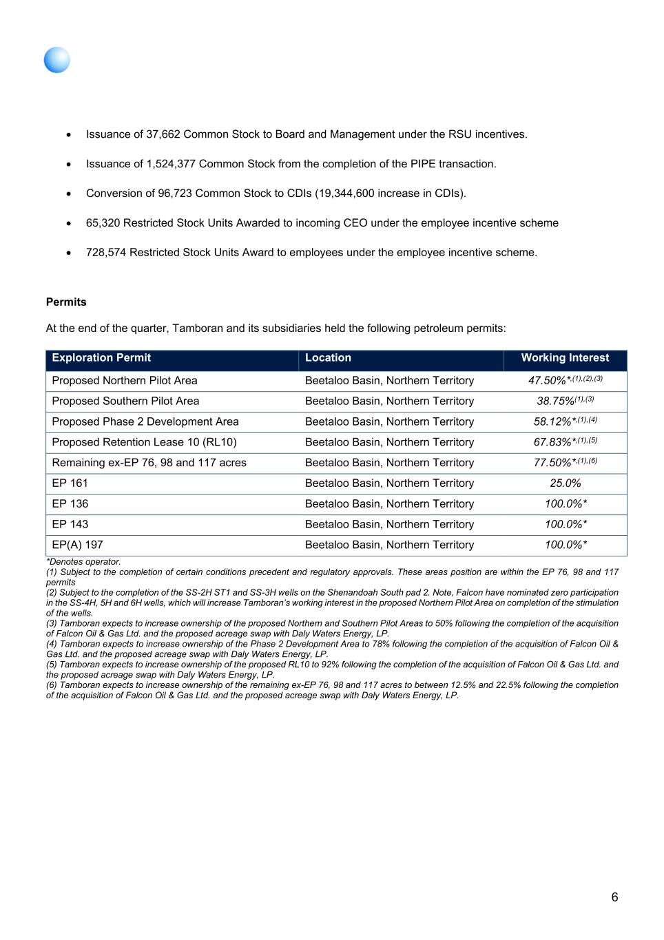 6 • Issuance of 37,662 Common Stock to Board and Management under the RSU incentives. • Issuance of 1,524,377 Common Stock from the completion of the PIPE transaction. • Conversion of 96,723 Common Stock to CDIs (19,344,600 increase in CDIs). • 65,320 Restricted Stock Units Awarded to incoming CEO under the employee incentive scheme • 728,574 Restricted Stock Units Award to employees under the employee incentive scheme. Permits At the end of the quarter, Tamboran and its subsidiaries held the following petroleum permits: Exploration Permit Location Working Interest Proposed Northern Pilot Area Beetaloo Basin, Northern Territory 47.50%*,(1),(2),(3) Proposed Southern Pilot Area Beetaloo Basin, Northern Territory 38.75%(1),(3) Proposed Phase 2 Development Area Beetaloo Basin, Northern Territory 58.12%*,(1),(4) Proposed Retention Lease 10 (RL10) Beetaloo Basin, Northern Territory 67.83%*,(1),(5) Remaining ex-EP 76, 98 and 117 acres Beetaloo Basin, Northern Territory 77.50%*,(1),(6) EP 161 Beetaloo Basin, Northern Territory 25.0% EP 136 Beetaloo Basin, Northern Territory 100.0%* EP 143 Beetaloo Basin, Northern Territory 100.0%* EP(A) 197 Beetaloo Basin, Northern Territory 100.0%* *Denotes operator. (1) Subject to the completion of certain conditions precedent and regulatory approvals. These areas position are within the EP 76, 98 and 117 permits (2) Subject to the completion of the SS-2H ST1 and SS-3H wells on the Shenandoah South pad 2. Note, Falcon have nominated zero participation in the SS-4H, 5H and 6H wells, which will increase Tamboran’s working interest in the proposed Northern Pilot Area on completion of the stimulation of the wells. (3) Tamboran expects to increase ownership of the proposed Northern and Southern Pilot Areas to 50% following the completion of the acquisition of Falcon Oil & Gas Ltd. and the proposed acreage swap with Daly Waters Energy, LP. (4) Tamboran expects to increase ownership of the Phase 2 Development Area to 78% following the completion of the acquisition of Falcon Oil & Gas Ltd. and the proposed acreage swap with Daly Waters Energy, LP. (5) Tamboran expects to increase ownership of the proposed RL10 to 92% following the completion of the acquisition of Falcon Oil & Gas Ltd. and the proposed acreage swap with Daly Waters Energy, LP. (6) Tamboran expects to increase ownership of the remaining ex-EP 76, 98 and 117 acres to between 12.5% and 22.5% following the completion of the acquisition of Falcon Oil & Gas Ltd. and the proposed acreage swap with Daly Waters Energy, LP.
