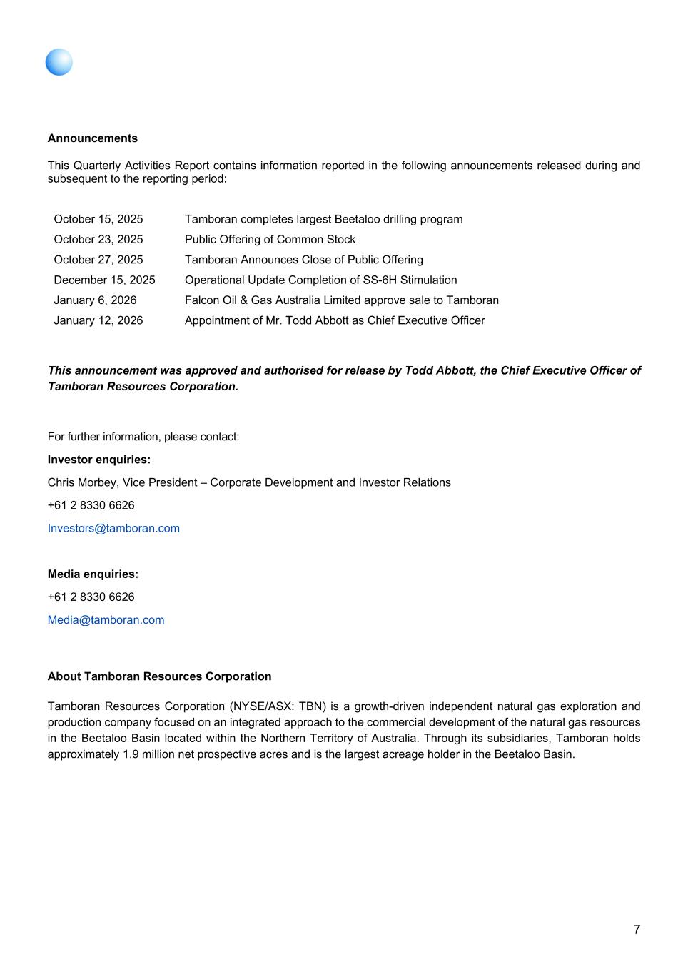 7 Announcements This Quarterly Activities Report contains information reported in the following announcements released during and subsequent to the reporting period: October 15, 2025 Tamboran completes largest Beetaloo drilling program October 23, 2025 Public Offering of Common Stock October 27, 2025 Tamboran Announces Close of Public Offering December 15, 2025 Operational Update Completion of SS-6H Stimulation January 6, 2026 Falcon Oil & Gas Australia Limited approve sale to Tamboran January 12, 2026 Appointment of Mr. Todd Abbott as Chief Executive Officer This announcement was approved and authorised for release by Todd Abbott, the Chief Executive Officer of Tamboran Resources Corporation. For further information, please contact: Investor enquiries: Chris Morbey, Vice President – Corporate Development and Investor Relations +61 2 8330 6626 Investors@tamboran.com Media enquiries: +61 2 8330 6626 Media@tamboran.com About Tamboran Resources Corporation Tamboran Resources Corporation (NYSE/ASX: TBN) is a growth-driven independent natural gas exploration and production company focused on an integrated approach to the commercial development of the natural gas resources in the Beetaloo Basin located within the Northern Territory of Australia. Through its subsidiaries, Tamboran holds approximately 1.9 million net prospective acres and is the largest acreage holder in the Beetaloo Basin.
