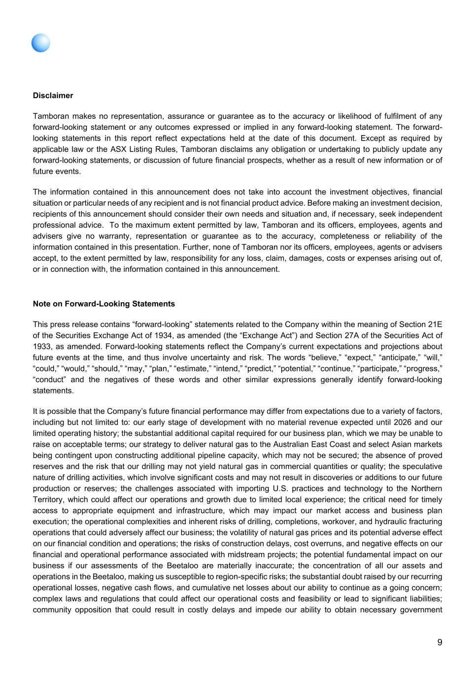 9 Disclaimer Tamboran makes no representation, assurance or guarantee as to the accuracy or likelihood of fulfilment of any forward-looking statement or any outcomes expressed or implied in any forward-looking statement. The forward- looking statements in this report reflect expectations held at the date of this document. Except as required by applicable law or the ASX Listing Rules, Tamboran disclaims any obligation or undertaking to publicly update any forward-looking statements, or discussion of future financial prospects, whether as a result of new information or of future events. The information contained in this announcement does not take into account the investment objectives, financial situation or particular needs of any recipient and is not financial product advice. Before making an investment decision, recipients of this announcement should consider their own needs and situation and, if necessary, seek independent professional advice. To the maximum extent permitted by law, Tamboran and its officers, employees, agents and advisers give no warranty, representation or guarantee as to the accuracy, completeness or reliability of the information contained in this presentation. Further, none of Tamboran nor its officers, employees, agents or advisers accept, to the extent permitted by law, responsibility for any loss, claim, damages, costs or expenses arising out of, or in connection with, the information contained in this announcement. Note on Forward-Looking Statements This press release contains “forward-looking” statements related to the Company within the meaning of Section 21E of the Securities Exchange Act of 1934, as amended (the “Exchange Act”) and Section 27A of the Securities Act of 1933, as amended. Forward-looking statements reflect the Company’s current expectations and projections about future events at the time, and thus involve uncertainty and risk. The words “believe,” “expect,” “anticipate,” “will,” “could,” “would,” “should,” “may,” “plan,” “estimate,” “intend,” “predict,” “potential,” “continue,” “participate,” “progress,” “conduct” and the negatives of these words and other similar expressions generally identify forward-looking statements. It is possible that the Company’s future financial performance may differ from expectations due to a variety of factors, including but not limited to: our early stage of development with no material revenue expected until 2026 and our limited operating history; the substantial additional capital required for our business plan, which we may be unable to raise on acceptable terms; our strategy to deliver natural gas to the Australian East Coast and select Asian markets being contingent upon constructing additional pipeline capacity, which may not be secured; the absence of proved reserves and the risk that our drilling may not yield natural gas in commercial quantities or quality; the speculative nature of drilling activities, which involve significant costs and may not result in discoveries or additions to our future production or reserves; the challenges associated with importing U.S. practices and technology to the Northern Territory, which could affect our operations and growth due to limited local experience; the critical need for timely access to appropriate equipment and infrastructure, which may impact our market access and business plan execution; the operational complexities and inherent risks of drilling, completions, workover, and hydraulic fracturing operations that could adversely affect our business; the volatility of natural gas prices and its potential adverse effect on our financial condition and operations; the risks of construction delays, cost overruns, and negative effects on our financial and operational performance associated with midstream projects; the potential fundamental impact on our business if our assessments of the Beetaloo are materially inaccurate; the concentration of all our assets and operations in the Beetaloo, making us susceptible to region-specific risks; the substantial doubt raised by our recurring operational losses, negative cash flows, and cumulative net losses about our ability to continue as a going concern; complex laws and regulations that could affect our operational costs and feasibility or lead to significant liabilities; community opposition that could result in costly delays and impede our ability to obtain necessary government