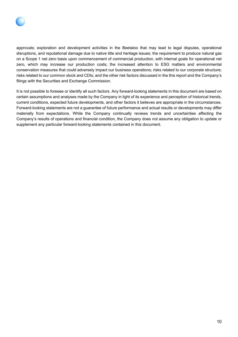 10 approvals; exploration and development activities in the Beetaloo that may lead to legal disputes, operational disruptions, and reputational damage due to native title and heritage issues; the requirement to produce natural gas on a Scope 1 net zero basis upon commencement of commercial production, with internal goals for operational net zero, which may increase our production costs; the increased attention to ESG matters and environmental conservation measures that could adversely impact our business operations; risks related to our corporate structure; risks related to our common stock and CDIs; and the other risk factors discussed in the this report and the Company’s filings with the Securities and Exchange Commission. It is not possible to foresee or identify all such factors. Any forward-looking statements in this document are based on certain assumptions and analyses made by the Company in light of its experience and perception of historical trends, current conditions, expected future developments, and other factors it believes are appropriate in the circumstances. Forward-looking statements are not a guarantee of future performance and actual results or developments may differ materially from expectations. While the Company continually reviews trends and uncertainties affecting the Company’s results of operations and financial condition, the Company does not assume any obligation to update or supplement any particular forward-looking statements contained in this document.