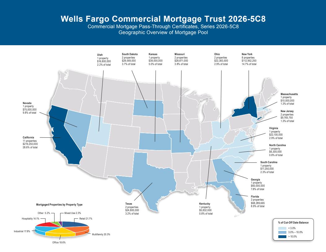 Wells Fargo Commercial Mortgage Securities, Inc. is offering certain classes of the Commercial Mortgage Pass-Through Certificates, Series 2026-5C8 consisting of the certificate classes identified in the table below. The certificates being offered by this prospectus (and the non-offered Class X-D, Class X-E, Class D, Class E, Class F-RR, Class G-RR and Class R certificates) represent the beneficial ownership interests in the issuing entity, which will be a New York common law trust named Wells Fargo Commercial Mortgage Trust 2026-5C8. The assets of the issuing entity will primarily consist of a pool of fixed rate commercial mortgage loans, which are generally the sole source of payments on the certificates. Credit enhancement will be provided solely by certain classes of subordinate certificates that will be subordinate to certain classes of senior certificates as described under “Description of the Certificates—Subordination; Allocation of Realized Losses”. Each class of certificates will be entitled to receive monthly distributions of interest and/or principal on the 4th business day following the 11th day of each month (or if the 11th day is not a business day, the next business day), commencing in April 2026. The rated final distribution date for the certificates is the distribution date in March 2059.