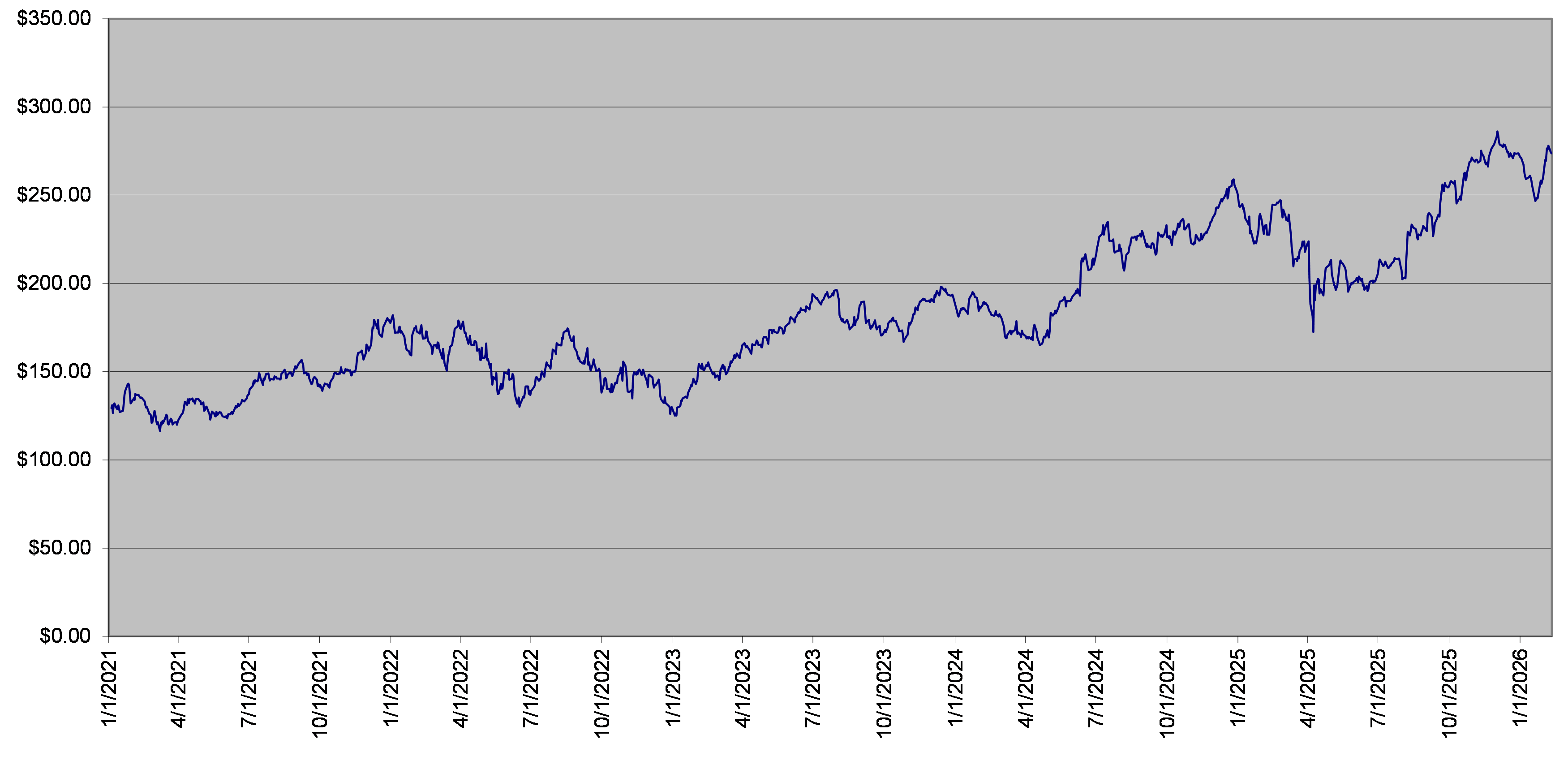 AAPL Stock Daily Closing Levels January 1, 2021 to February 10, 2026 |